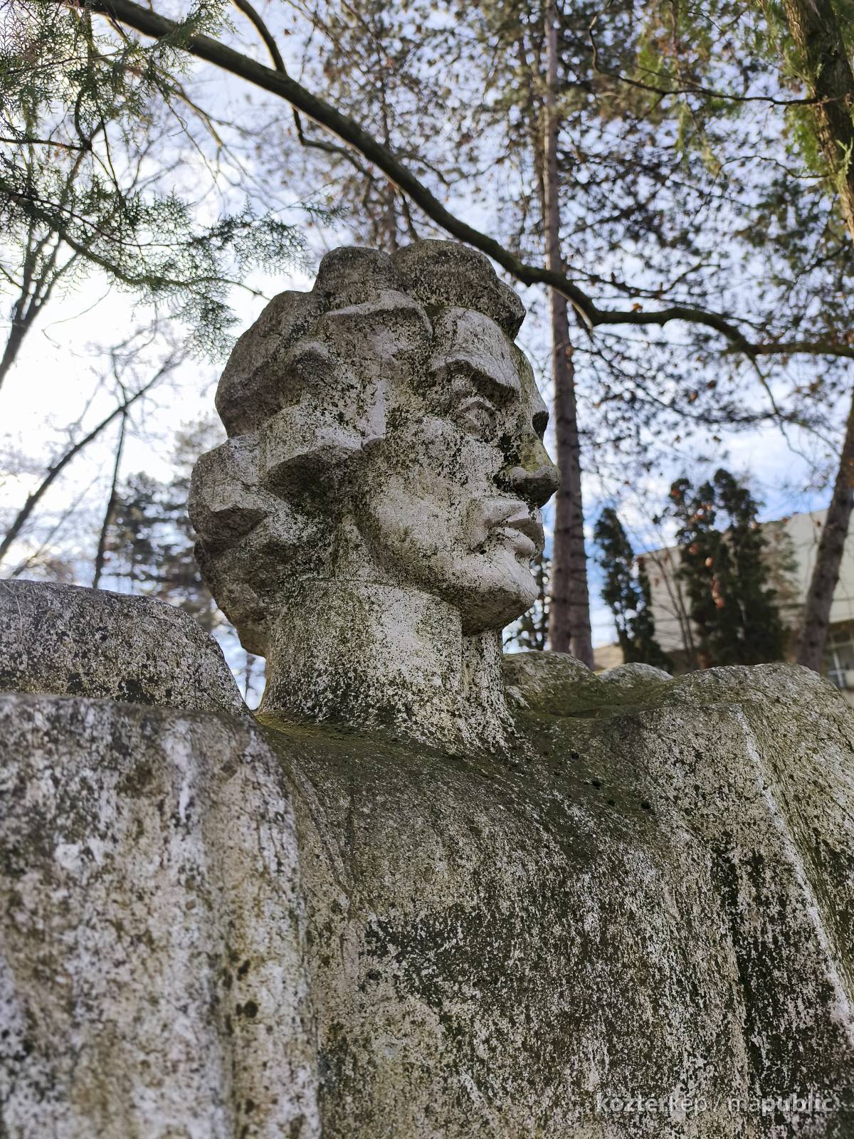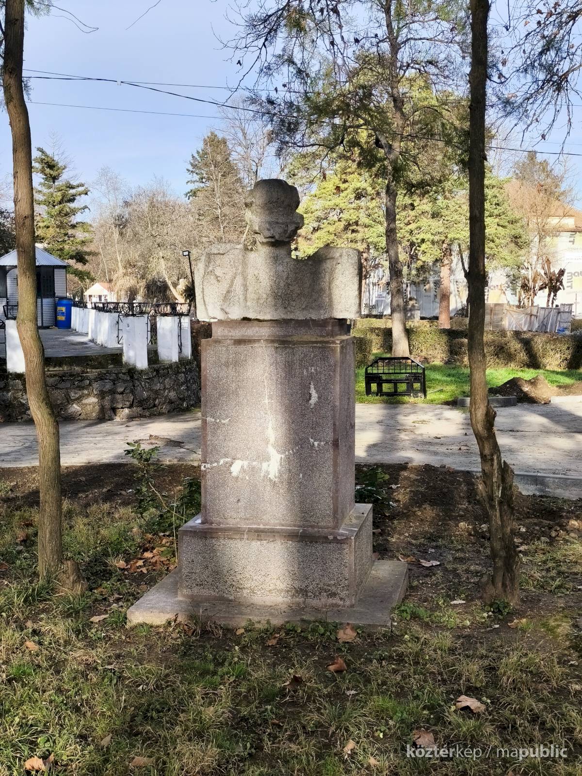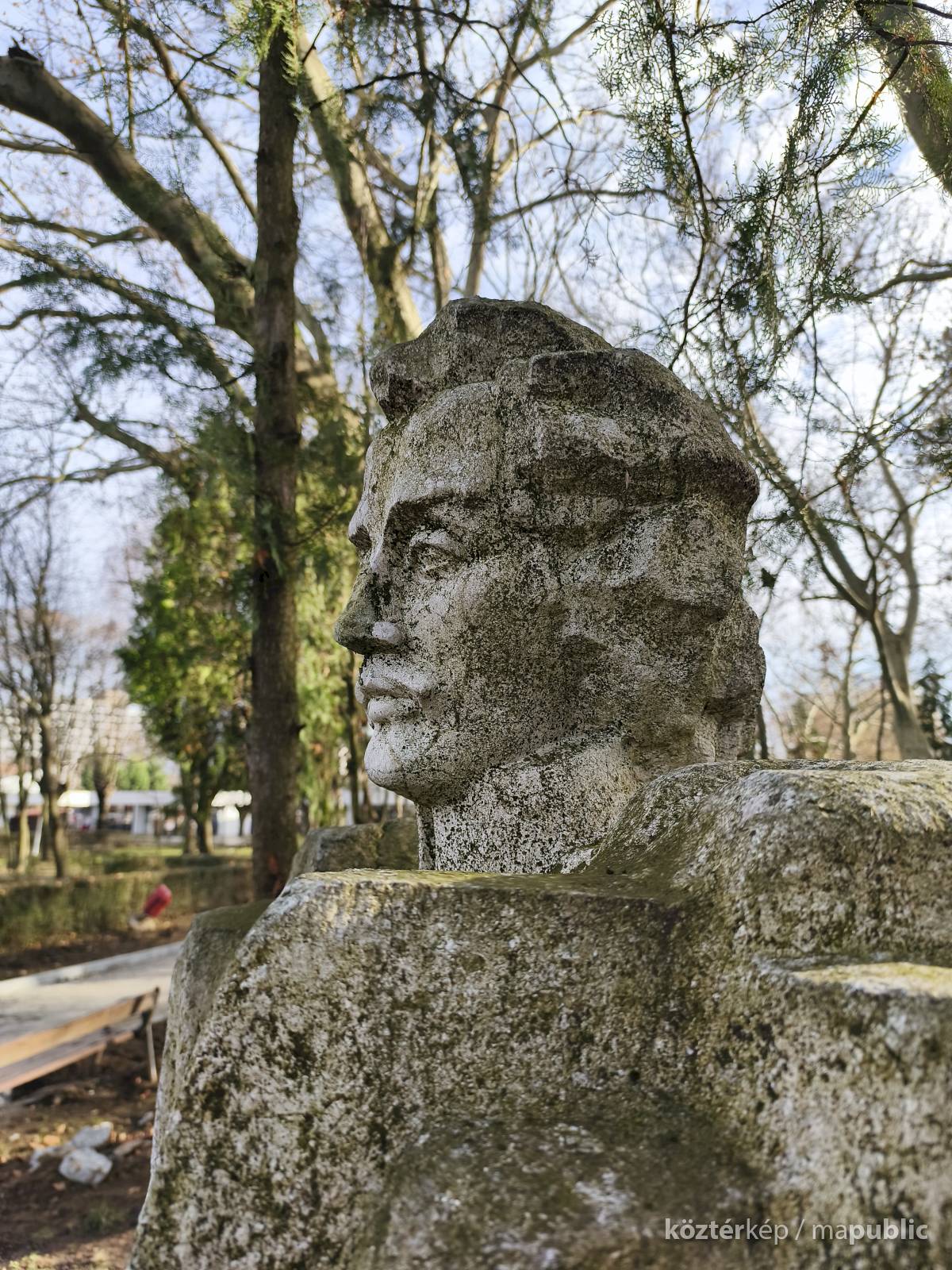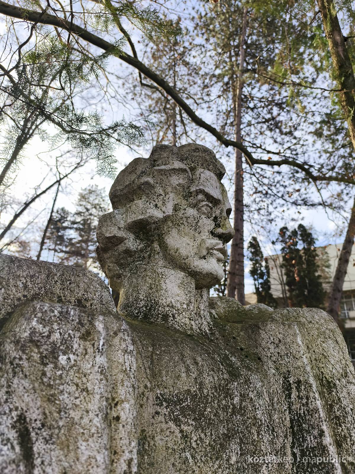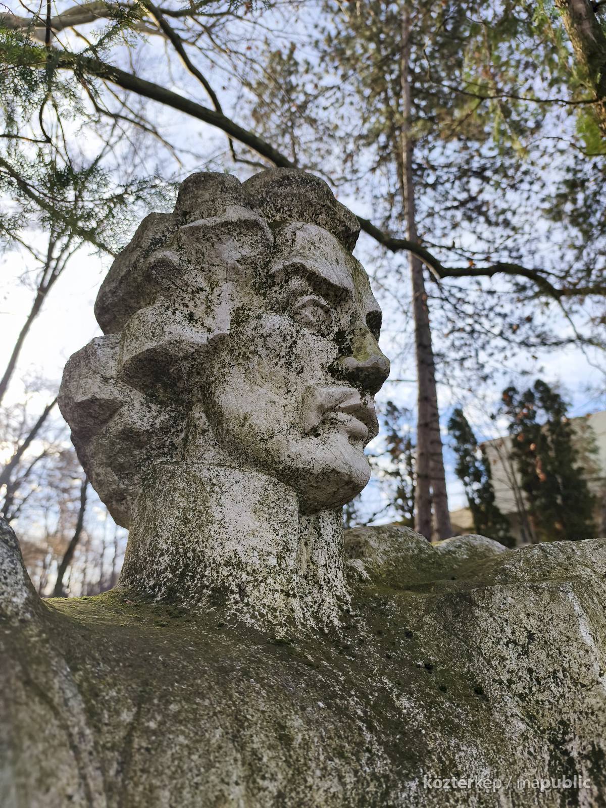 Tehát Petőfi Sándor költőnk állítólag ide járt gyógykezeltetni magát, élvezve a gyógyvíz jótékony hatását. Ennek emlékére avatták fel a faragott mészkőszobrot, mely egy sérült, vörösre színezett műkő talapzaton áll. Érdekes megmunkálás, durva vonások jellemzik az alkotást, de a fej profilból felismerhető. A költőt stilizált zubbonyban, magas gallérral, hosszú göndör fürtökkel ábrázolta a szobrász, Rodica Stanca Pamfil, [2] alkotói szignót nem találtam rajta. A művésznő oldalán olvashatjuk, hogy a mellszobrot 158cm széles, 110 cm magas, és 155 cm vastag kőből faragta. A talapzaton elöl egy nagy repedés, arany betűkkel festett név és évszámok olvashatók rajta.