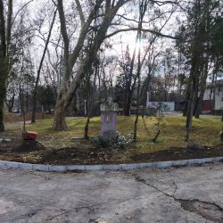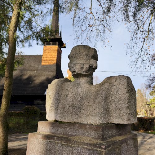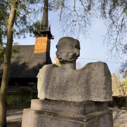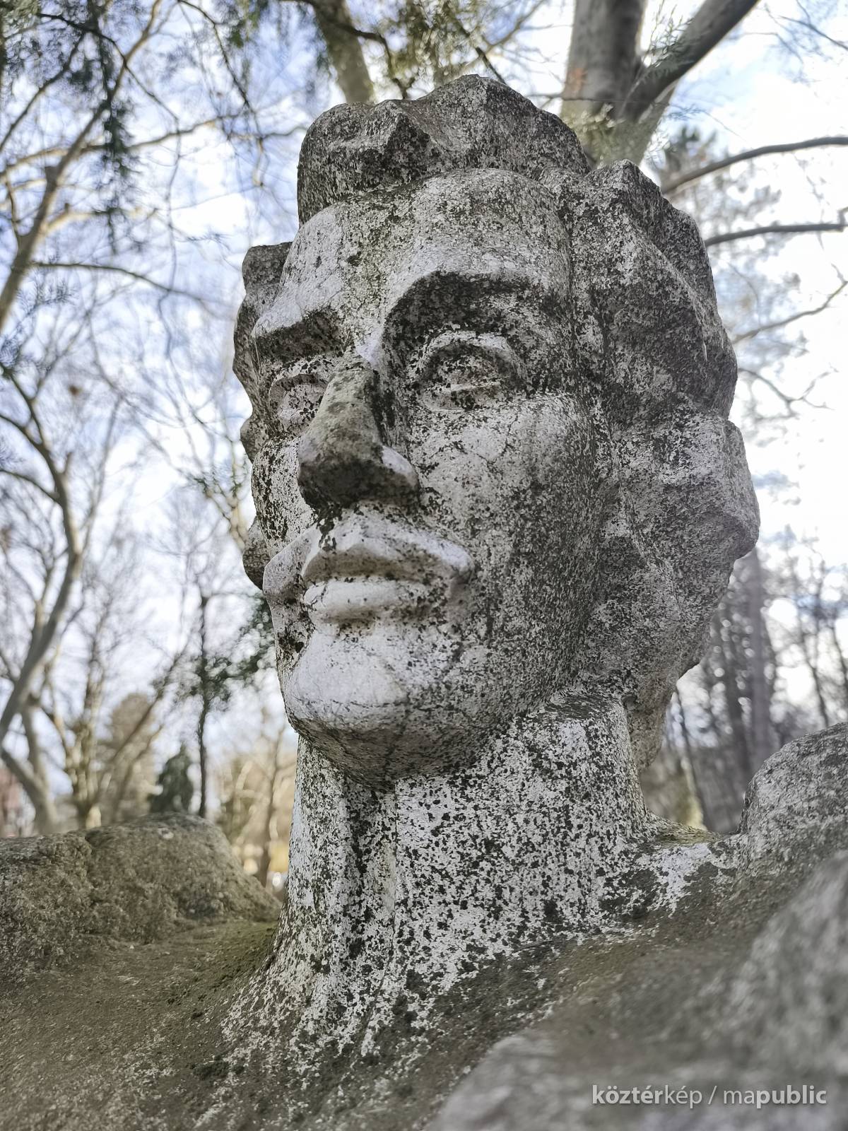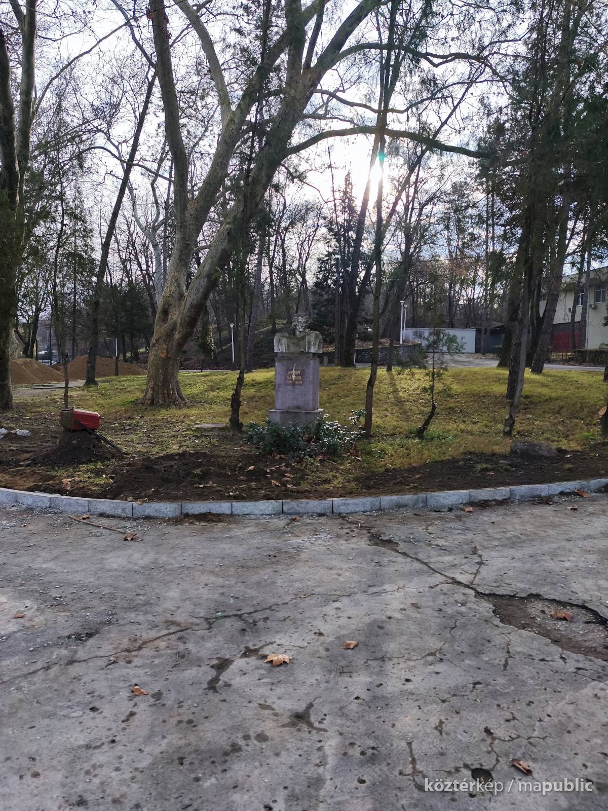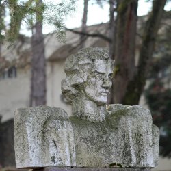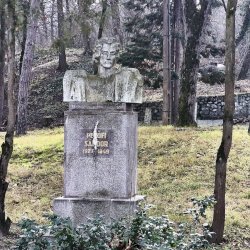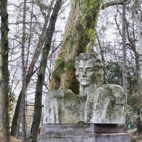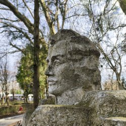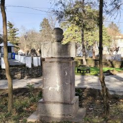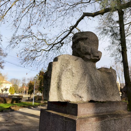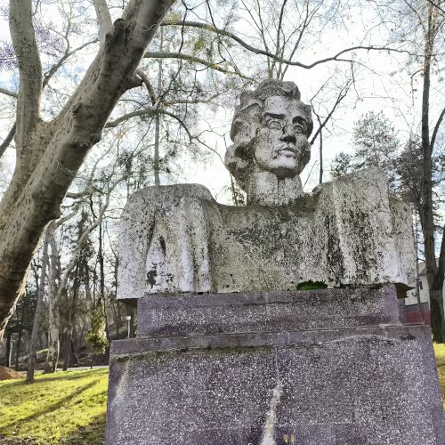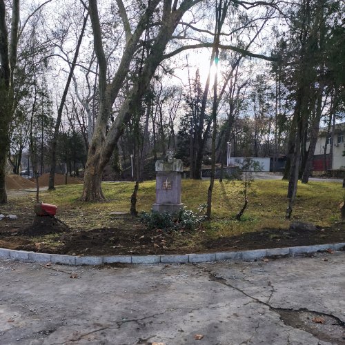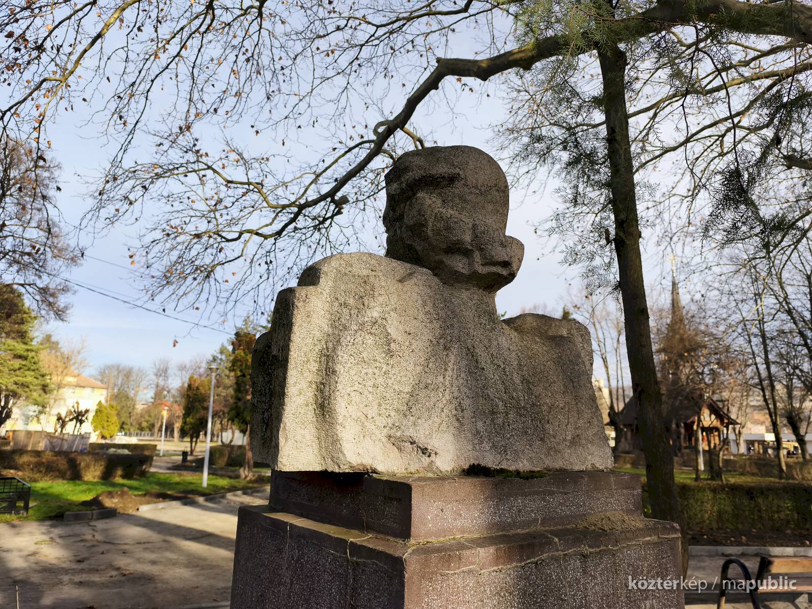 Tehát Petőfi Sándor költőnk állítólag ide járt gyógykezeltetni magát, élvezve a gyógyvíz jótékony hatását. Ennek emlékére avatták fel a faragott mészkőszobrot, mely egy sérült, vörösre színezett műkő talapzaton áll. Érdekes megmunkálás, durva vonások jellemzik az alkotást, de a fej profilból felismerhető. A költőt stilizált zubbonyban, magas gallérral, hosszú göndör fürtökkel ábrázolta a szobrász, Rodica Stanca Pamfil, [2] alkotói szignót nem találtam rajta. A művésznő oldalán olvashatjuk, hogy a mellszobrot 158cm széles, 110 cm magas, és 155 cm vastag kőből faragta. A talapzaton elöl egy nagy repedés, arany betűkkel festett név és évszámok olvashatók rajta.
