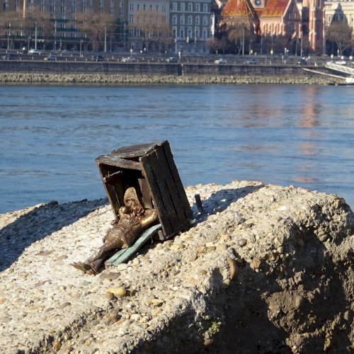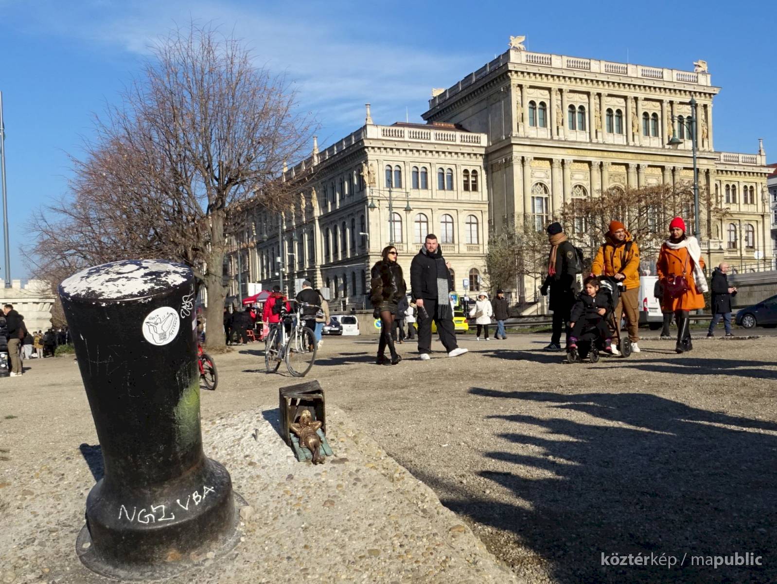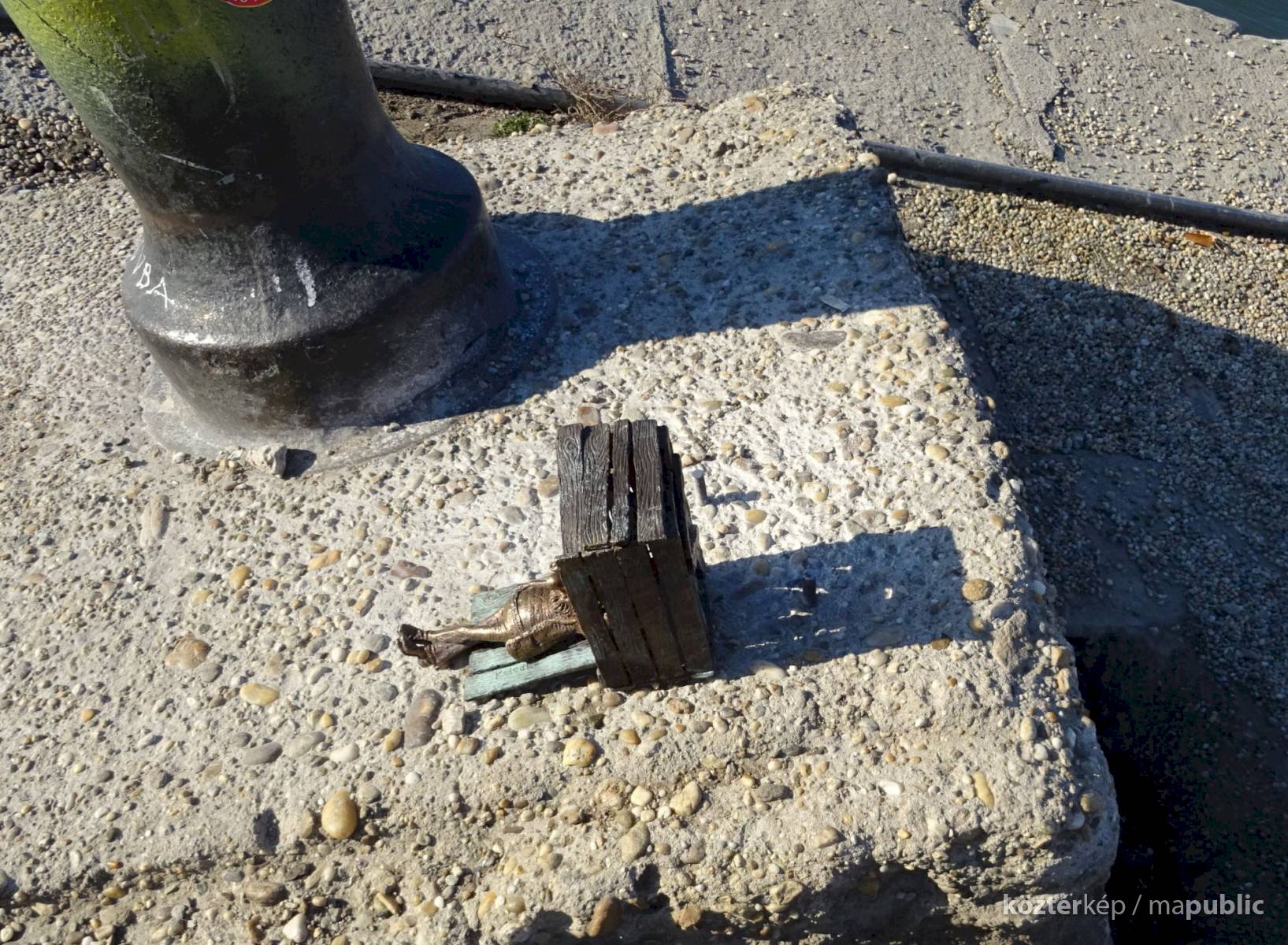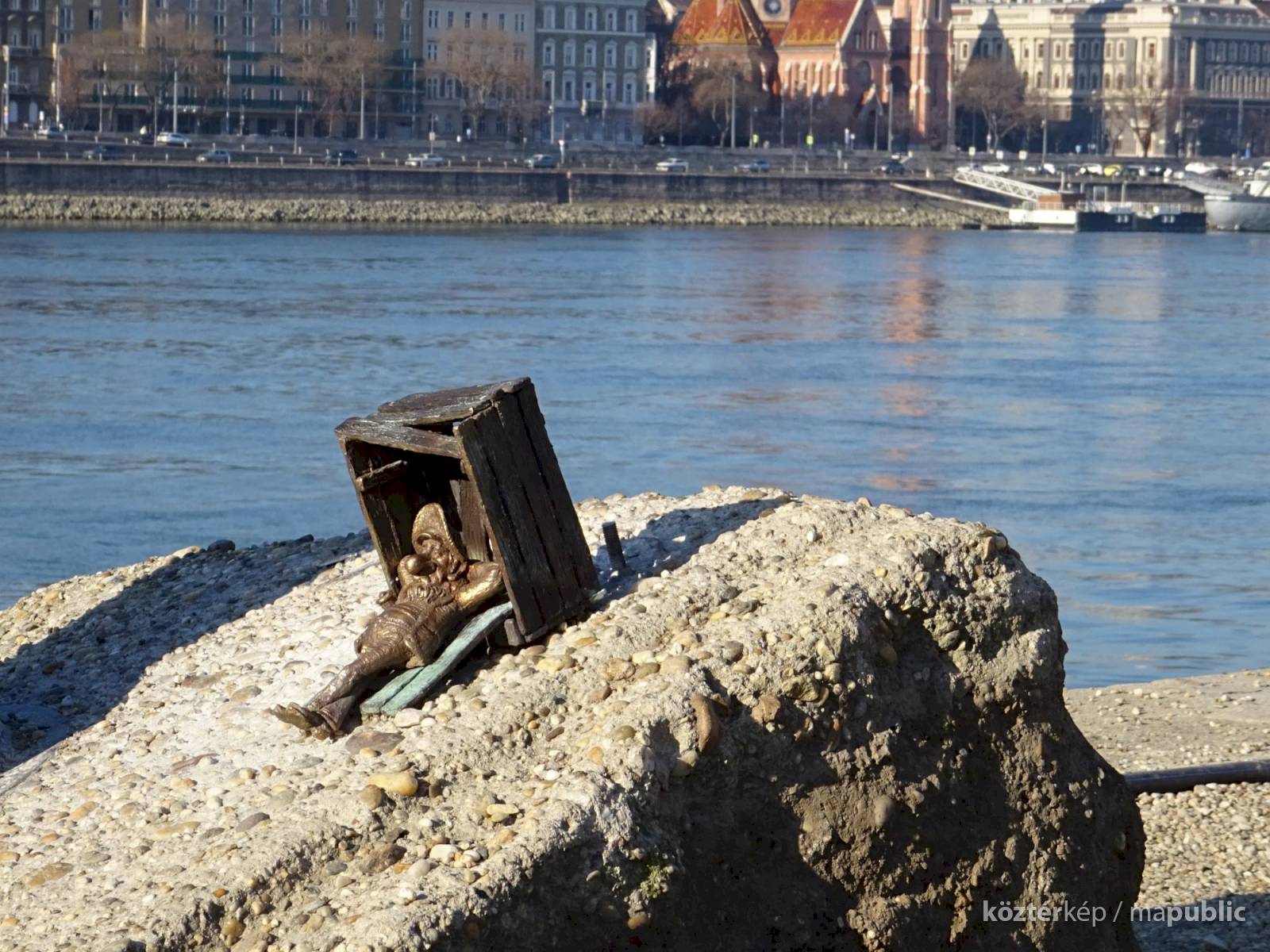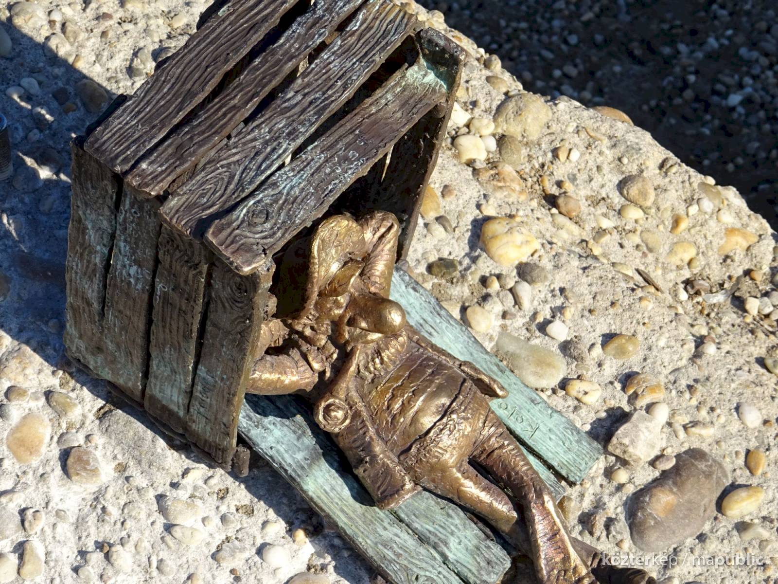 Piszkos Fred alakja heverészik agy rozzant láda tövében az Id. Antall József rakpart szélén, háta mögött átellenben a Magyar Tudományos Akadémia épülete.