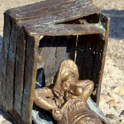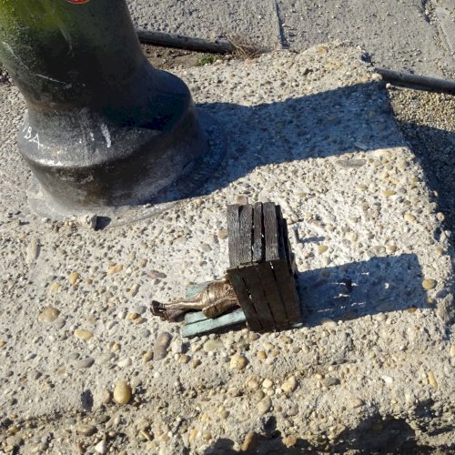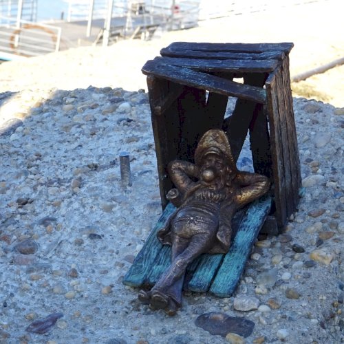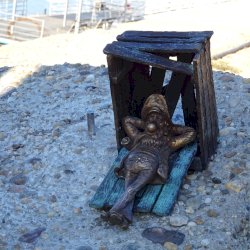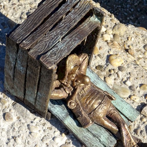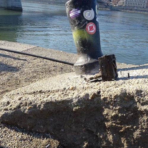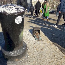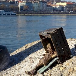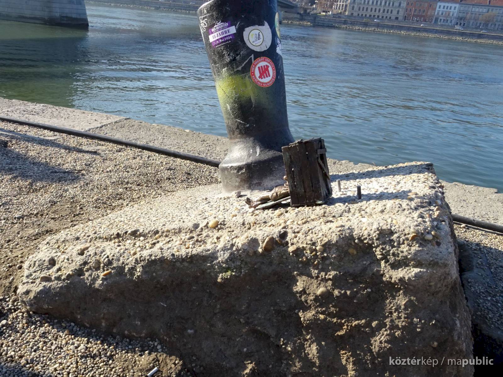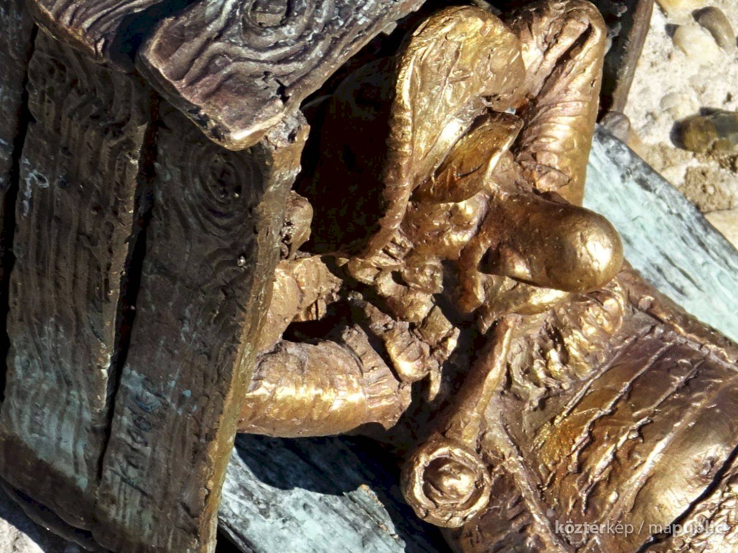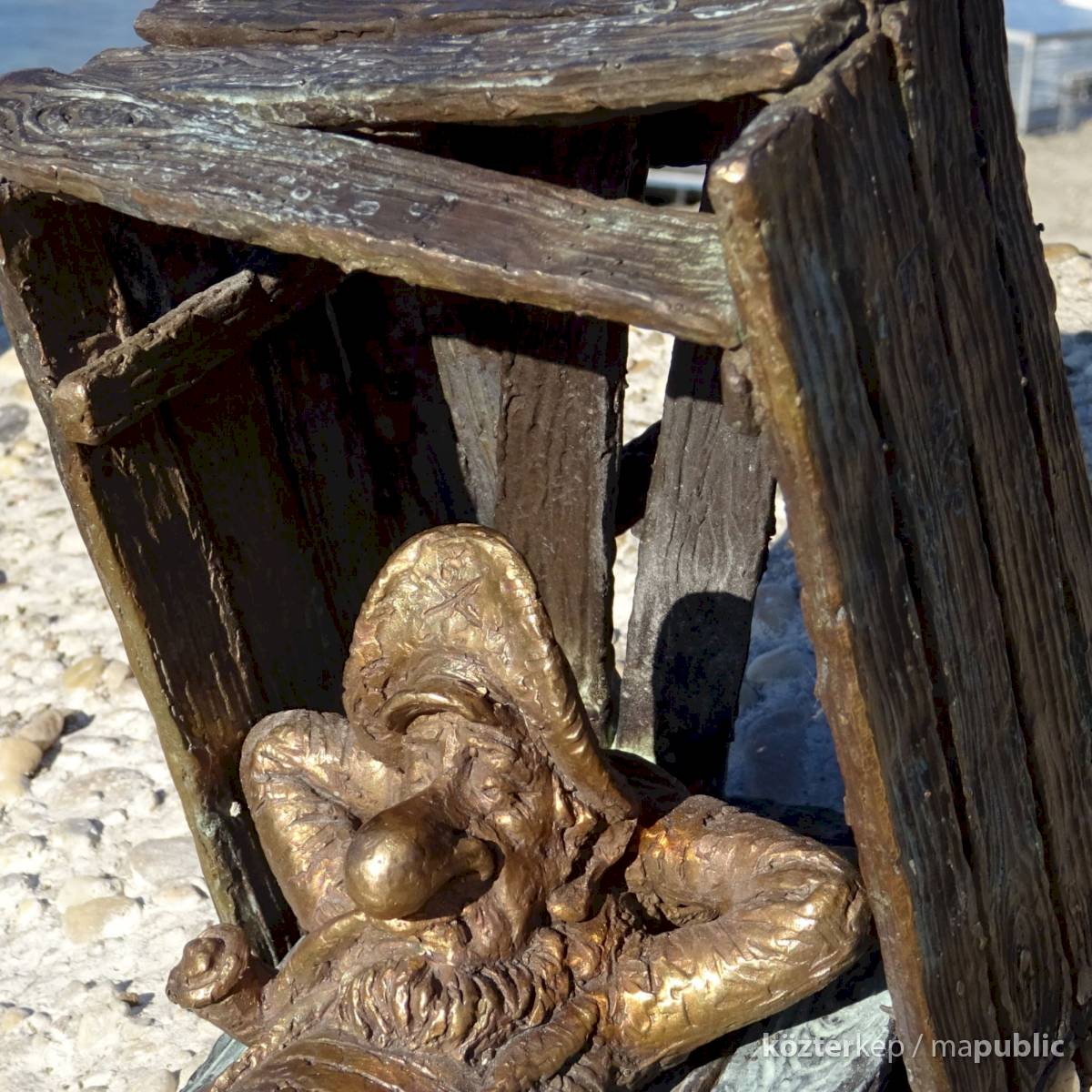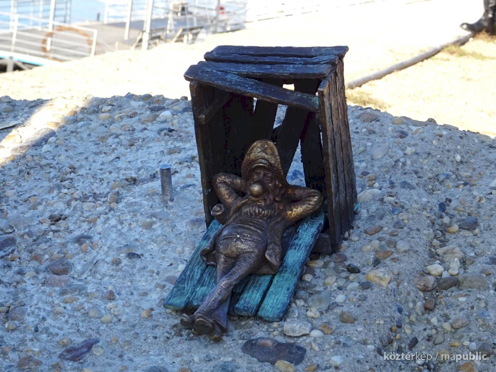 Piszkos Fred alakja heverészik agy rozzant láda tövében az Id. Antall József rakpart szélén, háta mögött átellenben a Magyar Tudományos Akadémia épülete.