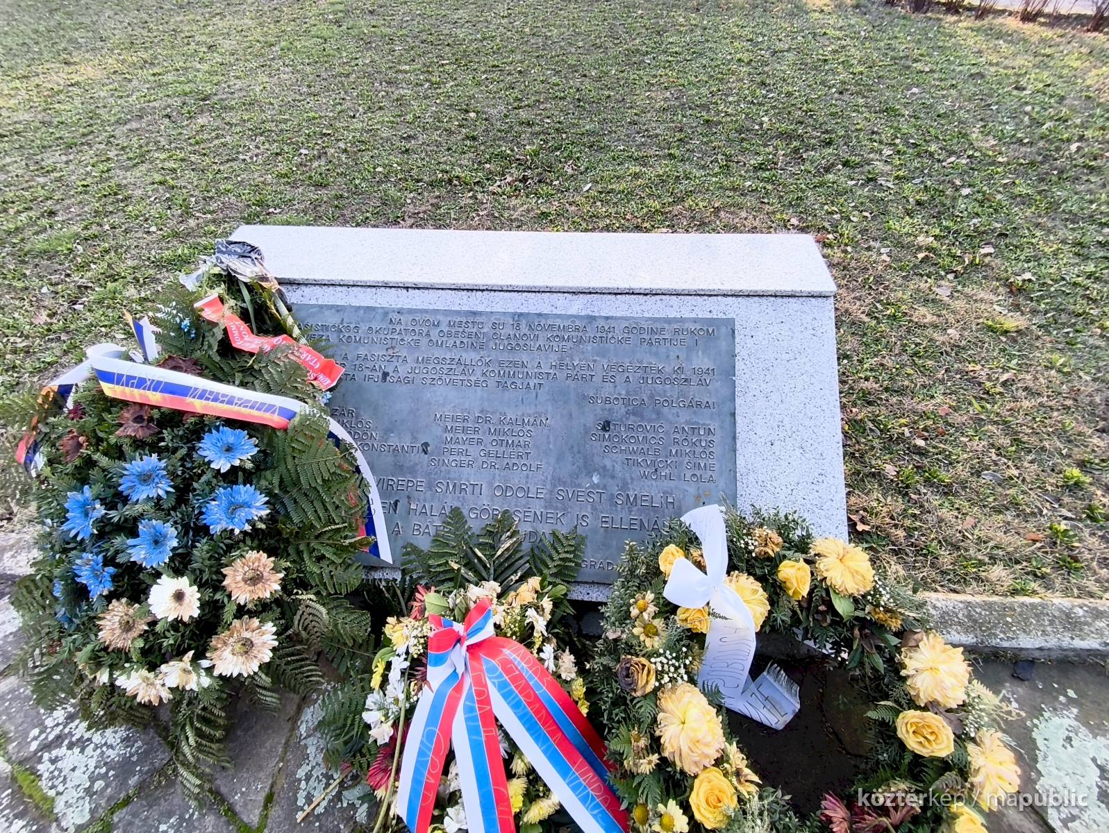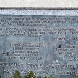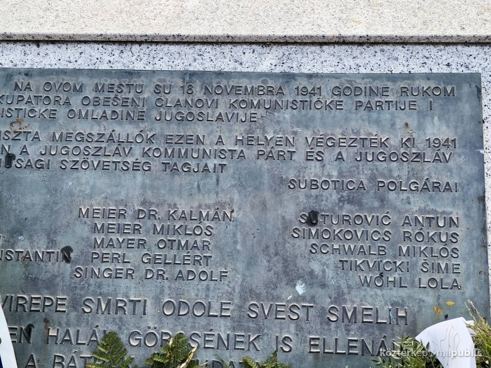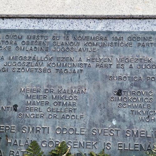 "A Szabadkai Bíróság épülete közelében áll az Akasztottak balladája címet viselő emlékmű. A szoborkompozíció tizenöt kivégzett szabadkai kommunista ellenállónak: Lazar Bašićnak, Gerson Miklósnak, Kornstein Ödönnek, Lackenbach Konstantinnak, Lukács Istvánnak, dr. Meier Kálmánnak, Meier Miklósnak, Mayer Ottmárnak, Perl Gellértnek, dr. Adolf Singernek, Antun Suturovićnak, Simokovics Rókusnak, Schwalb Miklósnak, Šime Tikvickinek és Wohl Lolának állít emléket." [1]