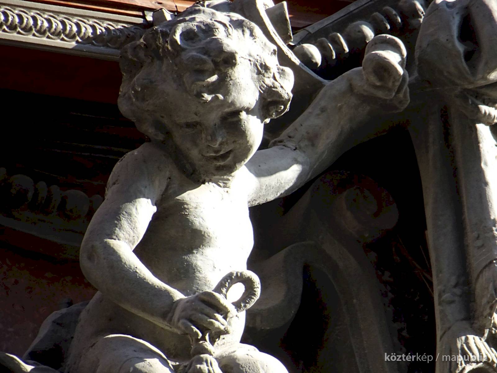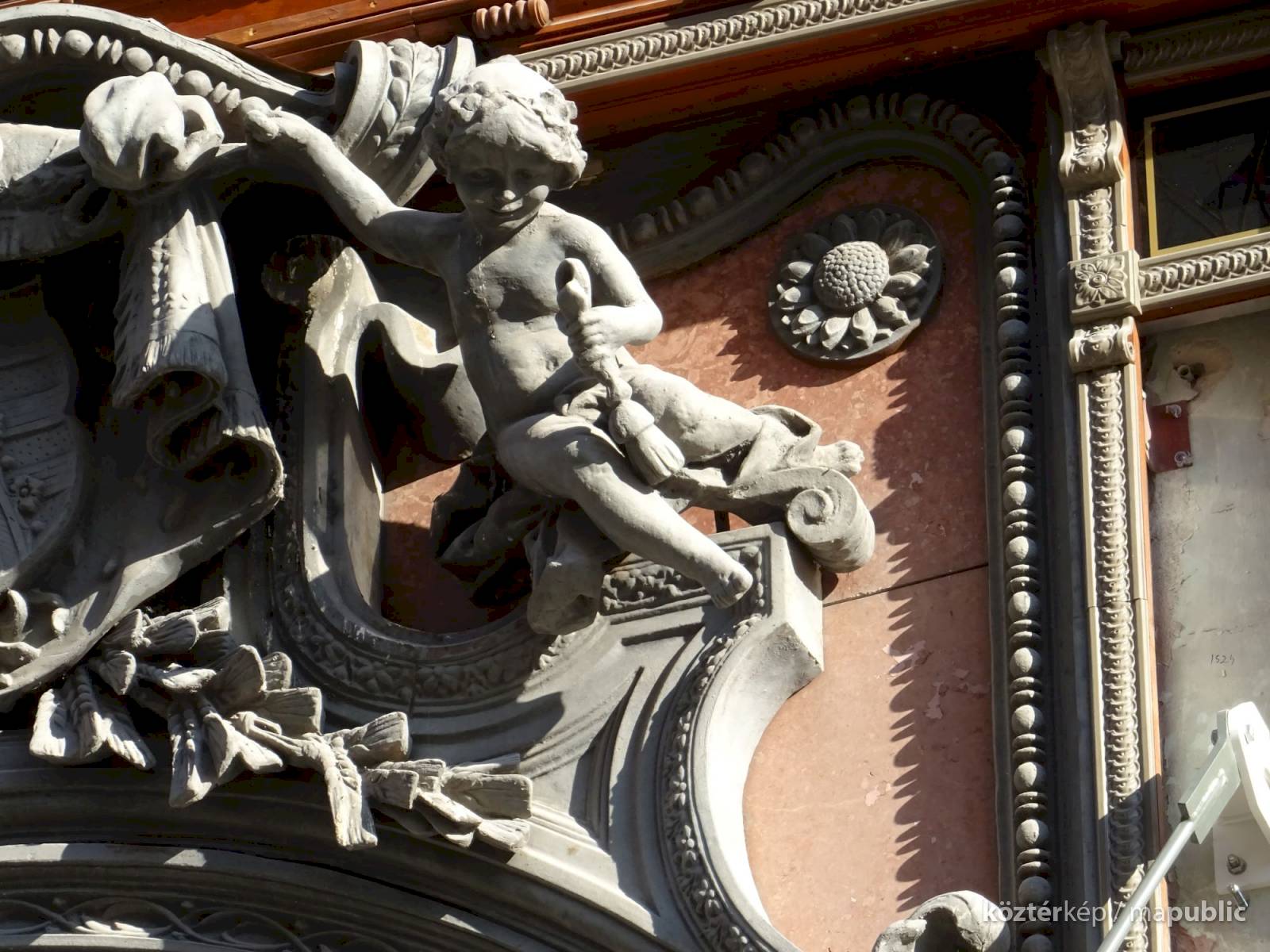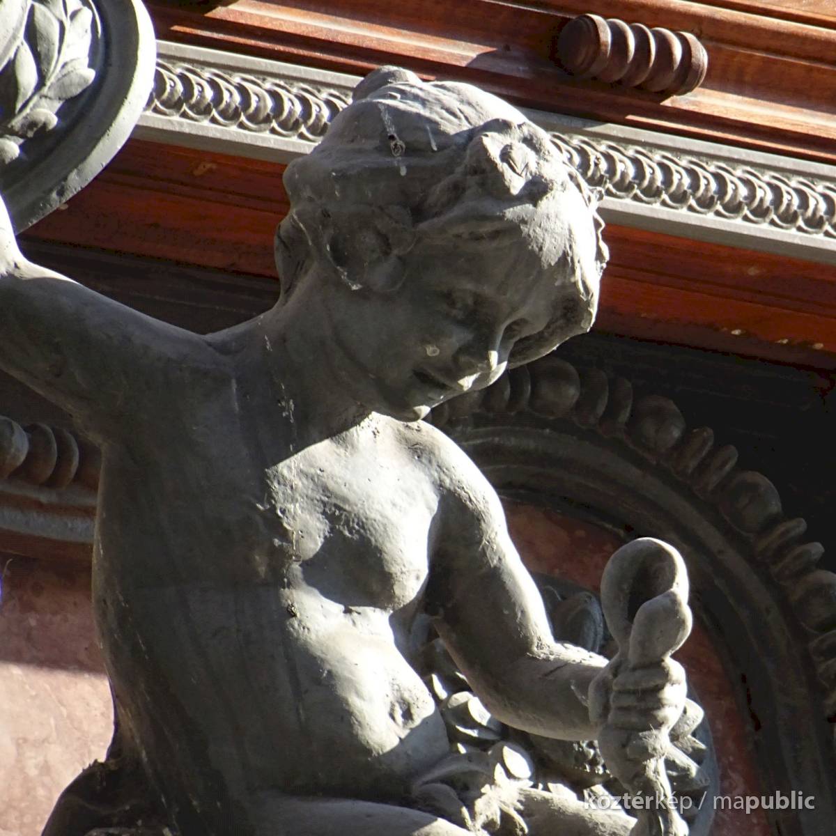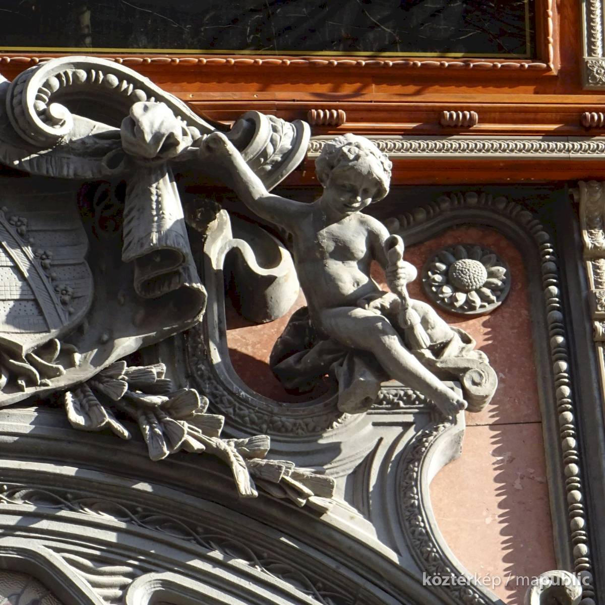 A rácsozat maga ugyan nem túl hivalkodó, de felfelé haladva különböző szépségek, díszítmények jelennek meg. Igaz, hogy a felső részen az üvegbetét ornamentális díszítés, de nagyon szép – bár itt a színek harmóniája a fényviszonyok miatt kevésbé érvényesül. A címert két gyerekfigura – egy fiúcska és egy lány, az ő hajában virágdíszeket látunk – tartja. Nem veszik túl komolyan a feladatot, mindkettő csupa mosoly, enyhén szólva csíntalanok.