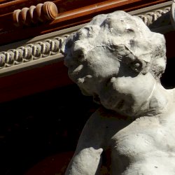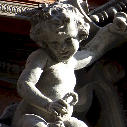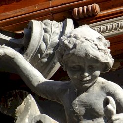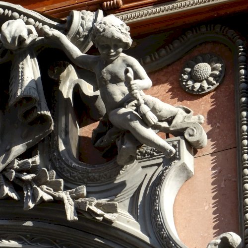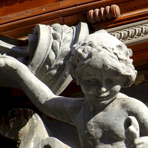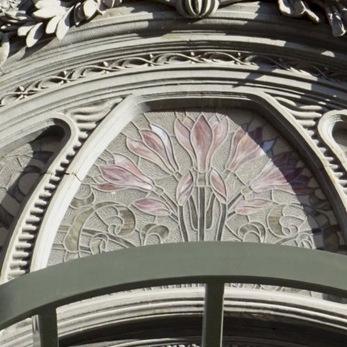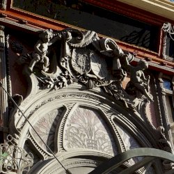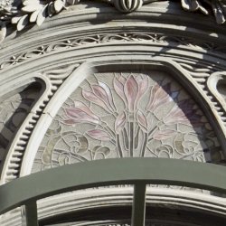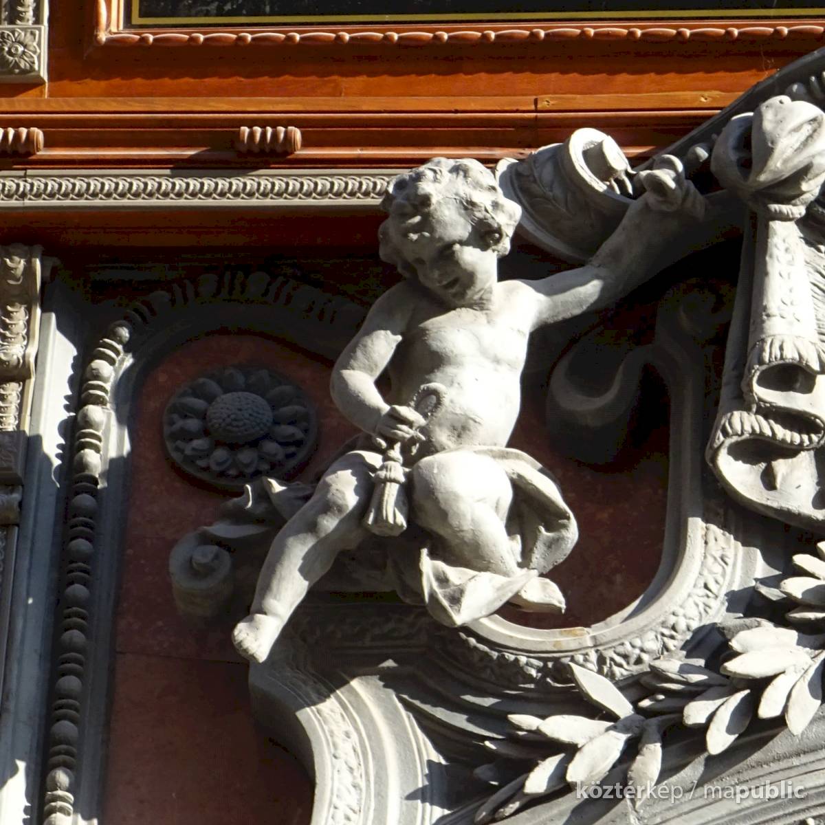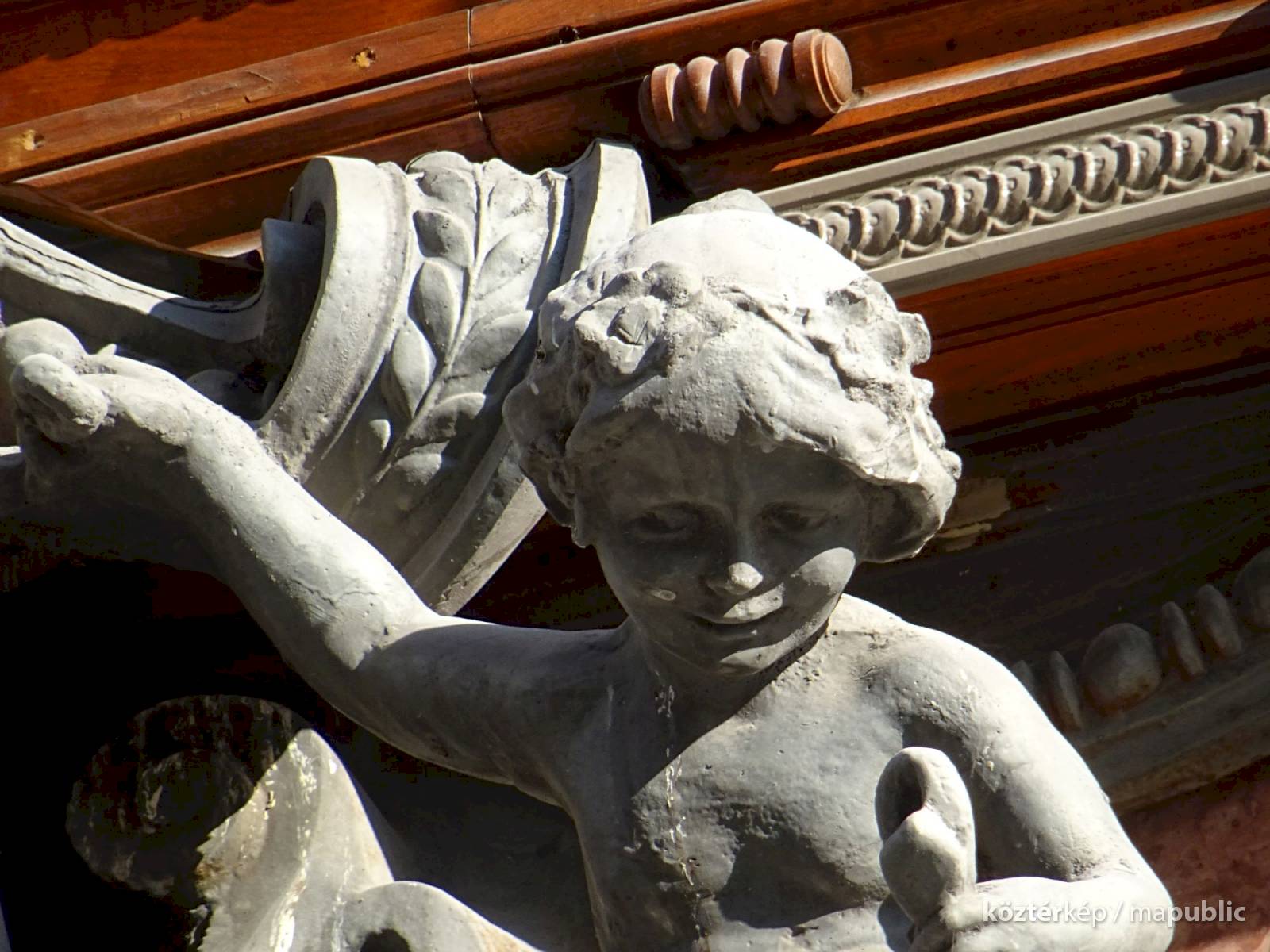 A rácsozat maga ugyan nem túl hivalkodó, de felfelé haladva különböző szépségek, díszítmények jelennek meg. Igaz, hogy a felső részen az üvegbetét ornamentális díszítés, de nagyon szép – bár itt a színek harmóniája a fényviszonyok miatt kevésbé érvényesül. A címert két gyerekfigura – egy fiúcska és egy lány, az ő hajában virágdíszeket látunk – tartja. Nem veszik túl komolyan a feladatot, mindkettő csupa mosoly, enyhén szólva csíntalanok.