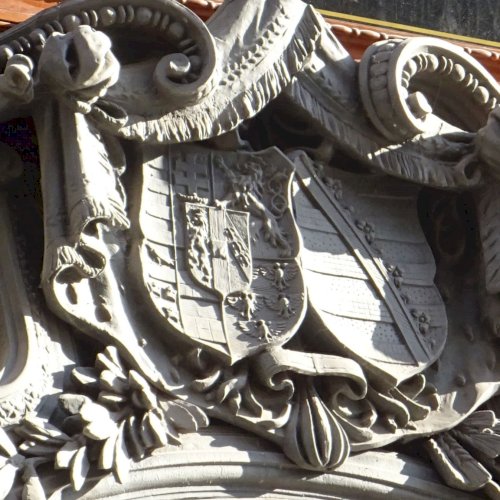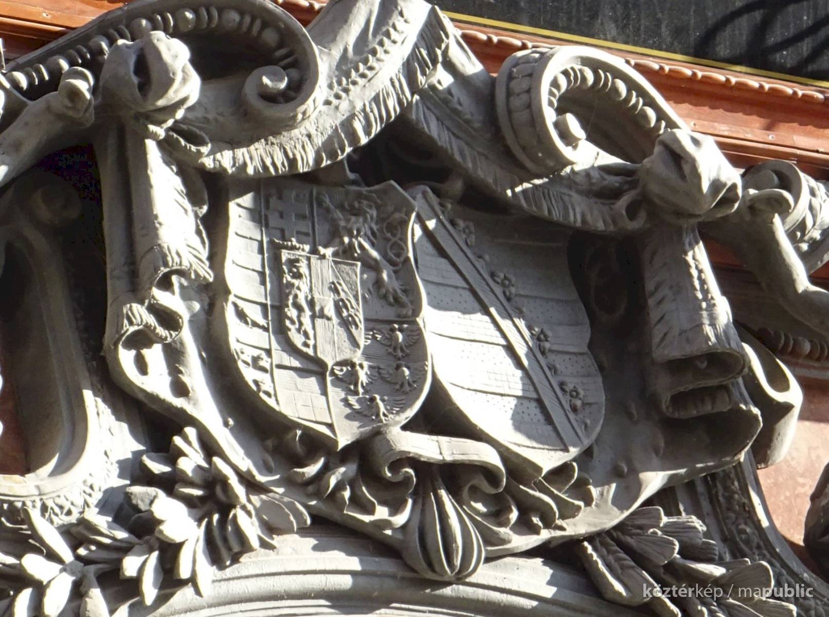 A kapu felett, a középpontban áll a nemesi címer, ami itt is a házasság (József Károly főherceg és Klotild Mária főhercegné) révén összekapcsolódó két család címereiből áll össze. Pontosítva ez a Habsburg és Wettin címer: