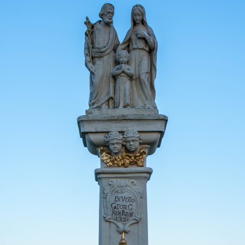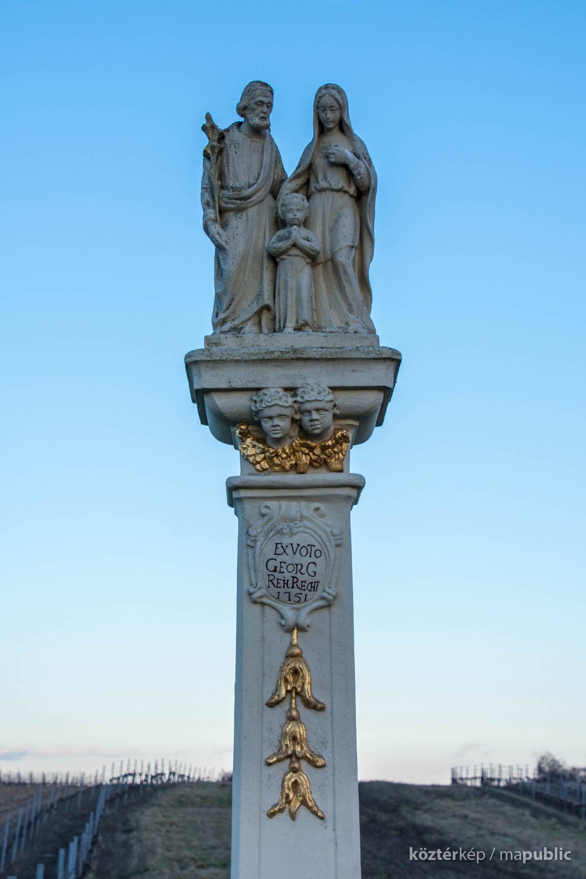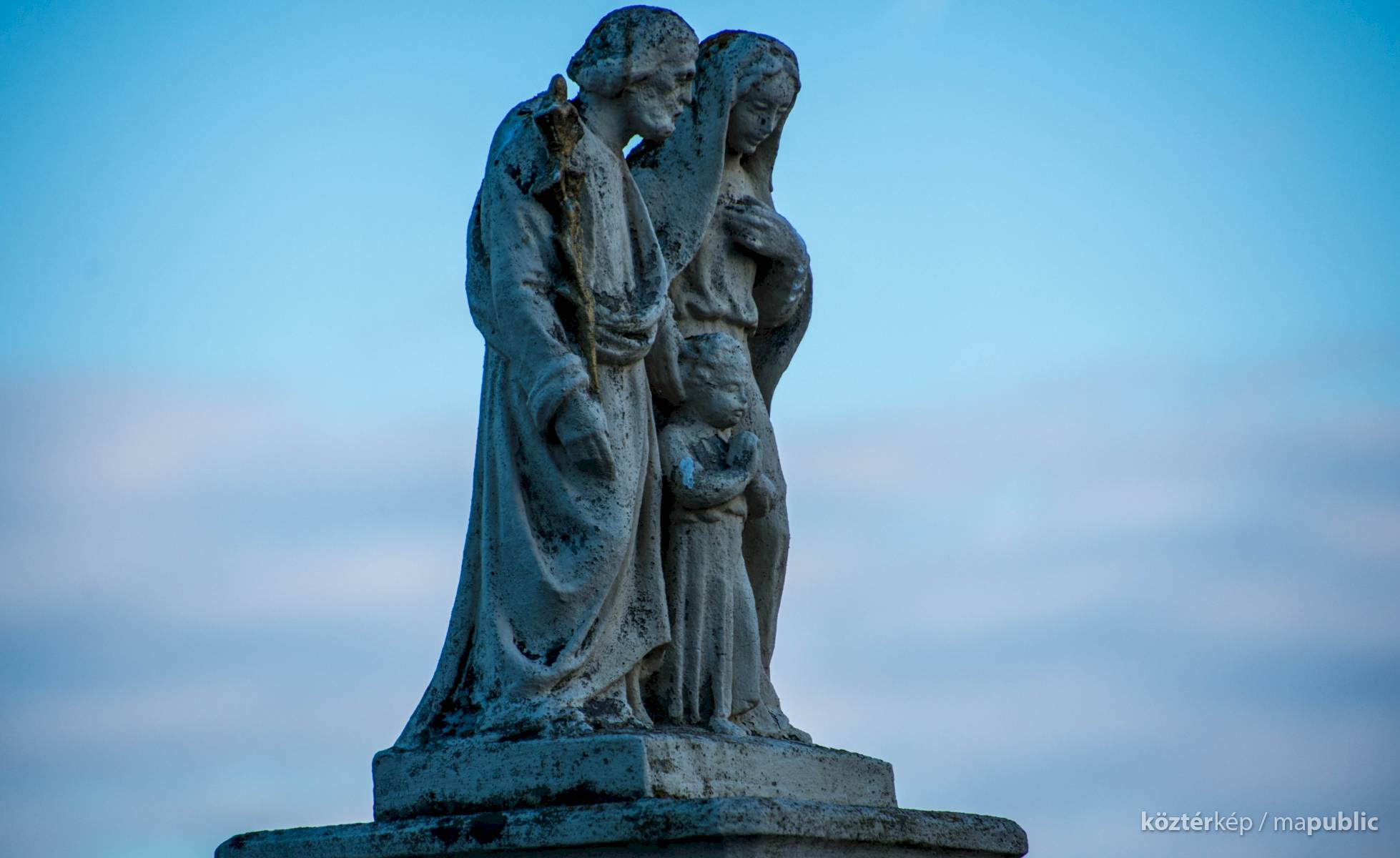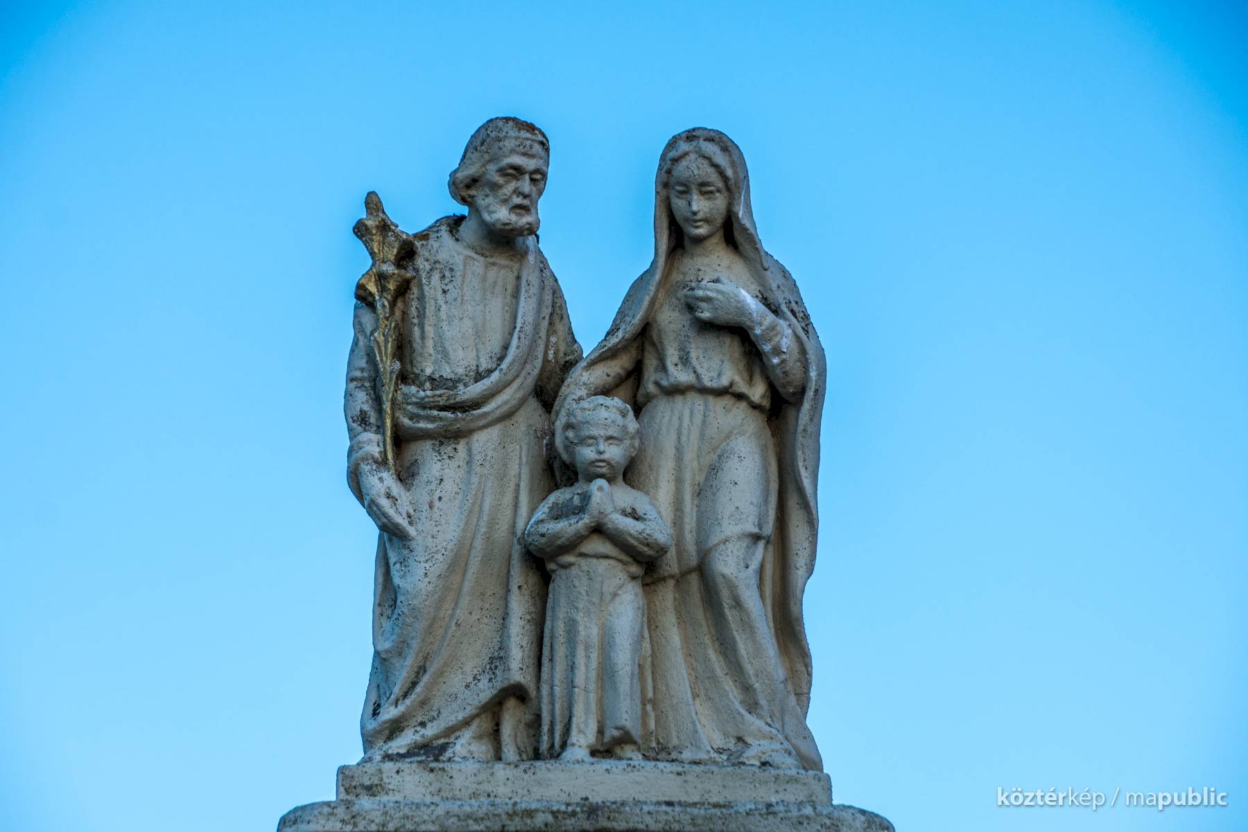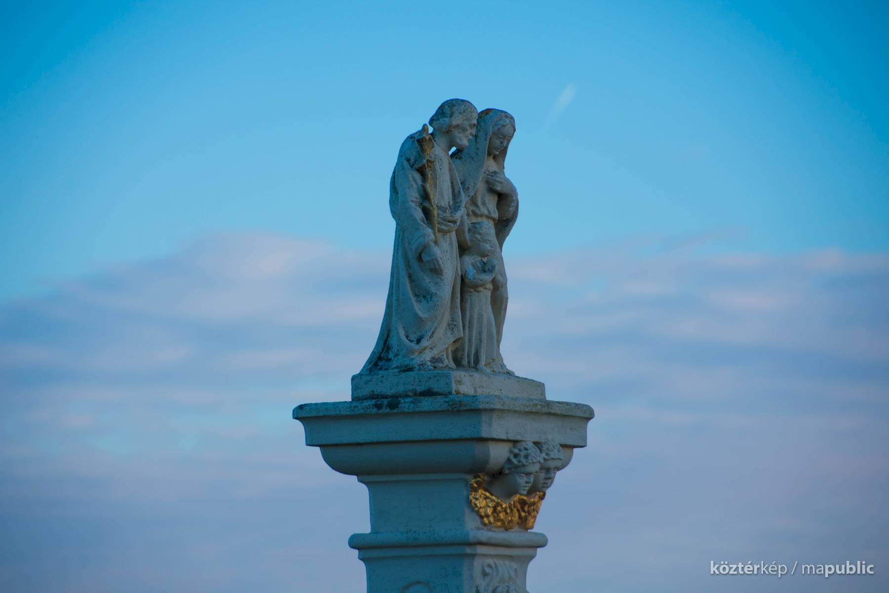 A fogadalmi, kerubfejekkel díszített Szentcsalád szobor 1751-ben készült az oszlopon olvasható felirat szerint.
