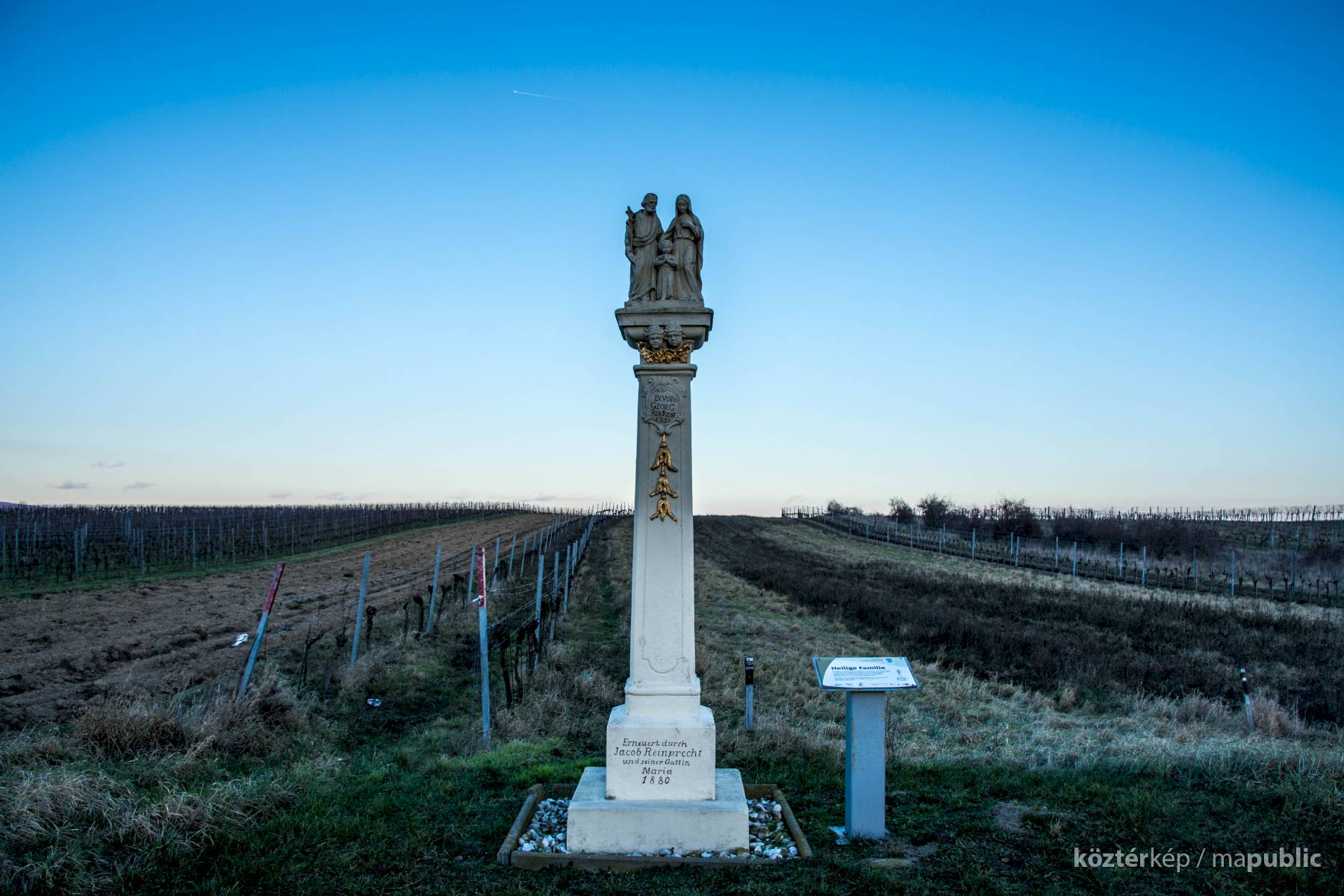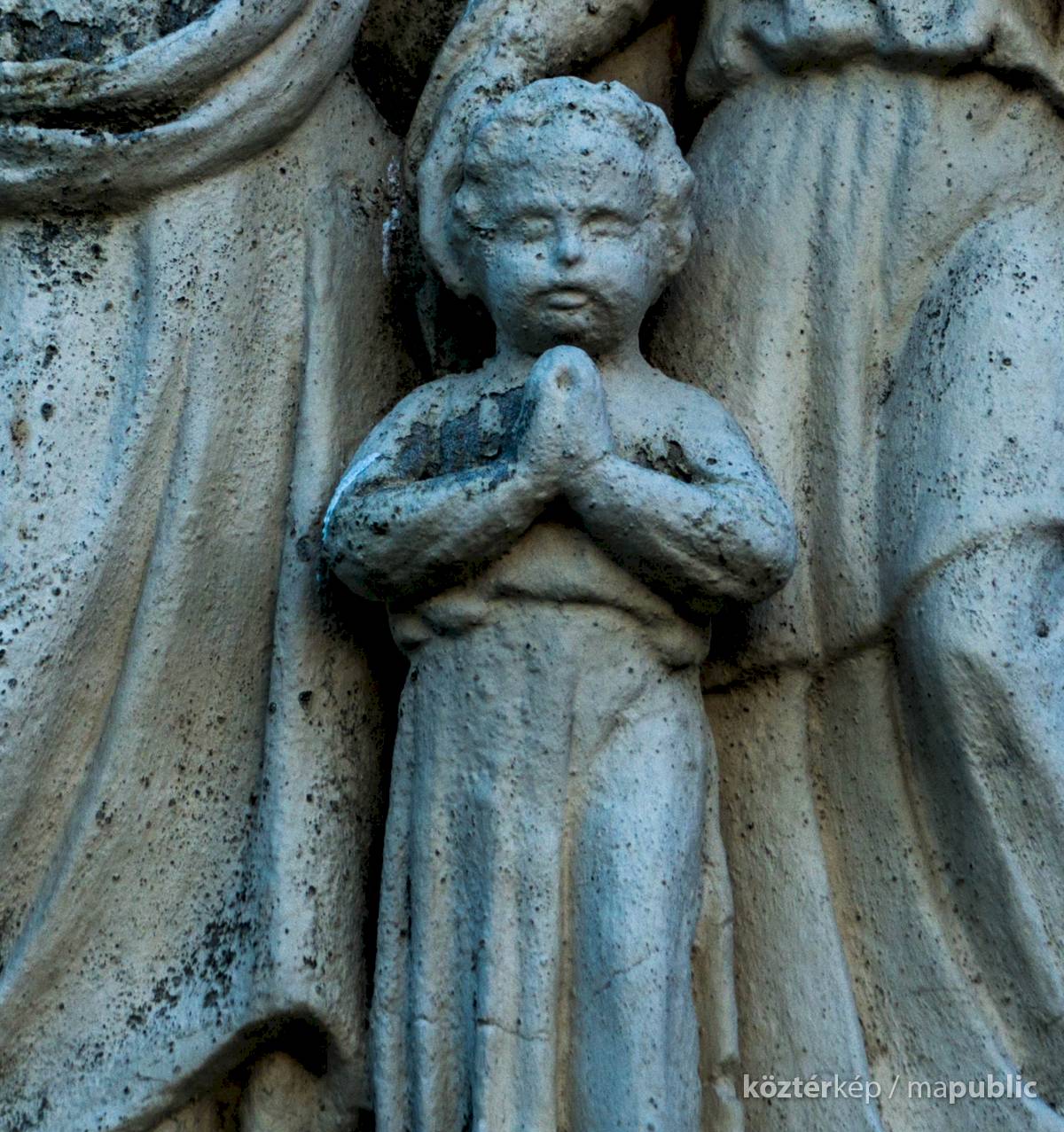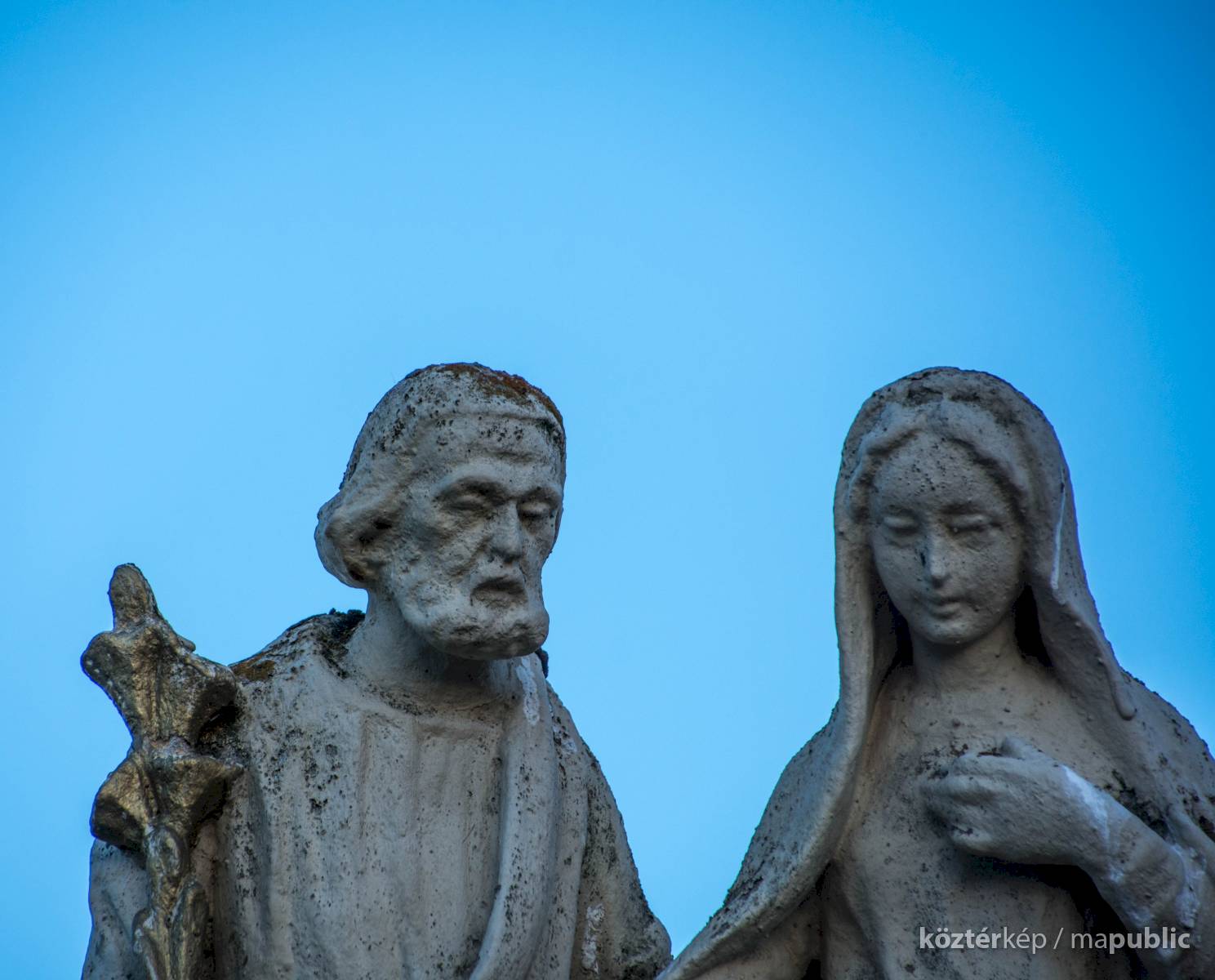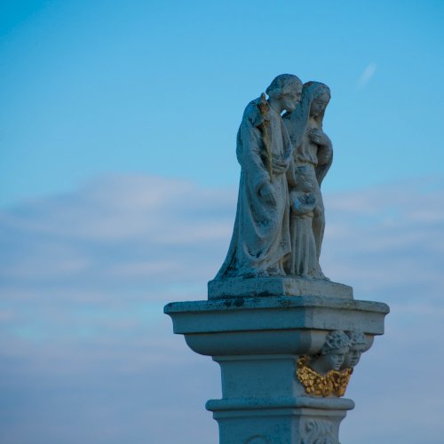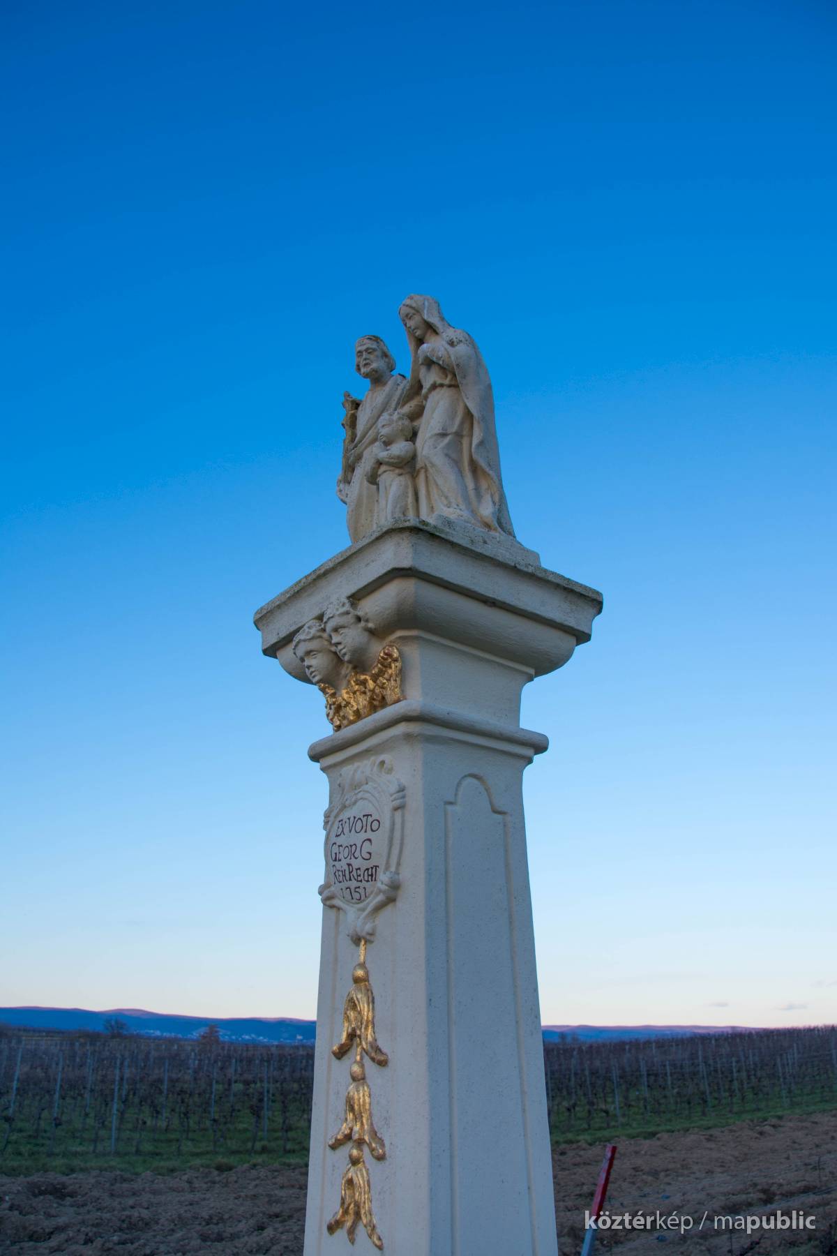 A fogadalmi, kerubfejekkel díszített Szentcsalád szobor 1751-ben készült az oszlopon olvasható felirat szerint.