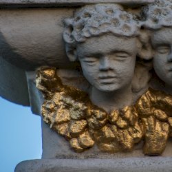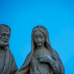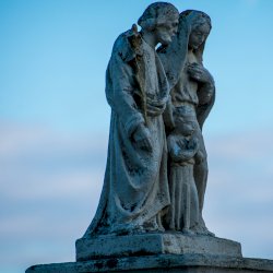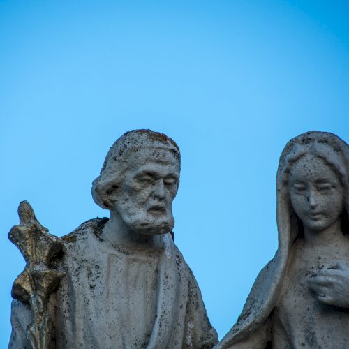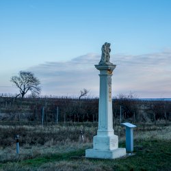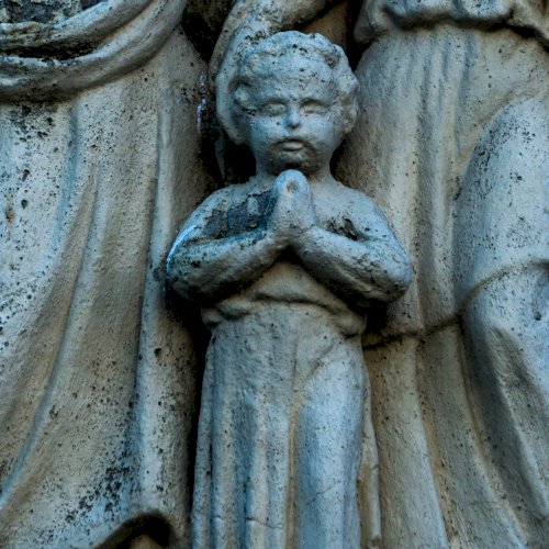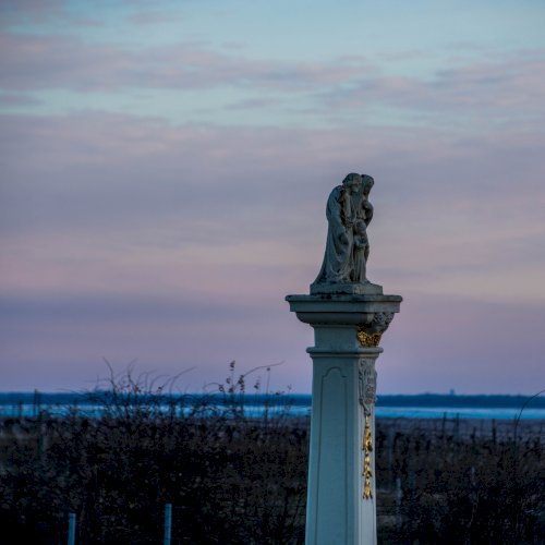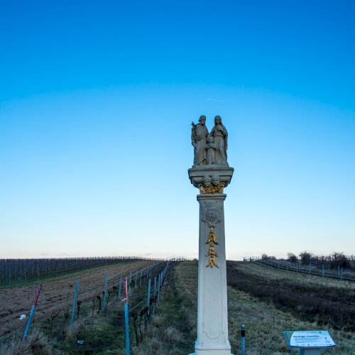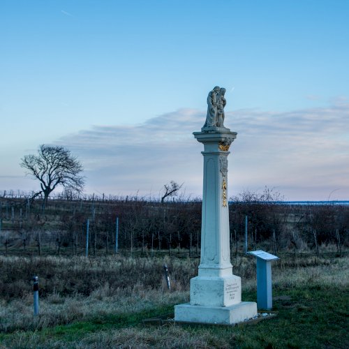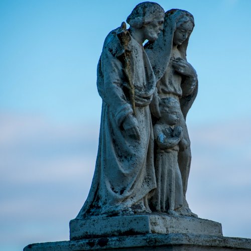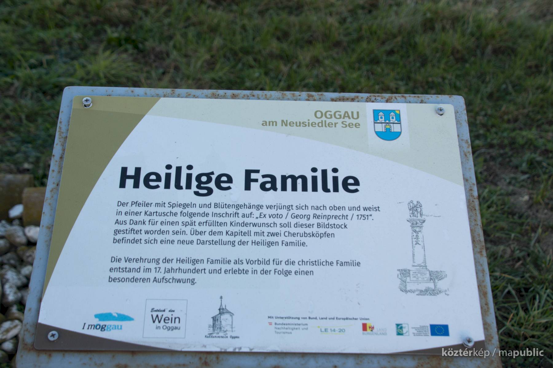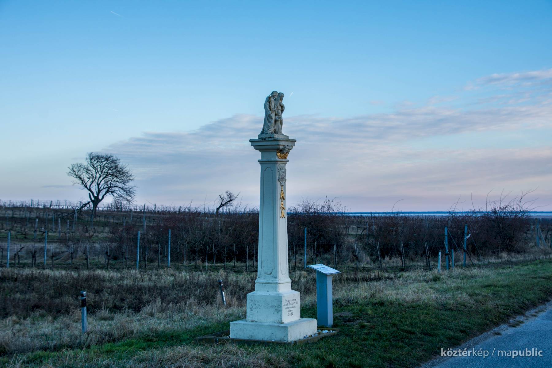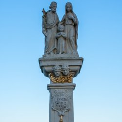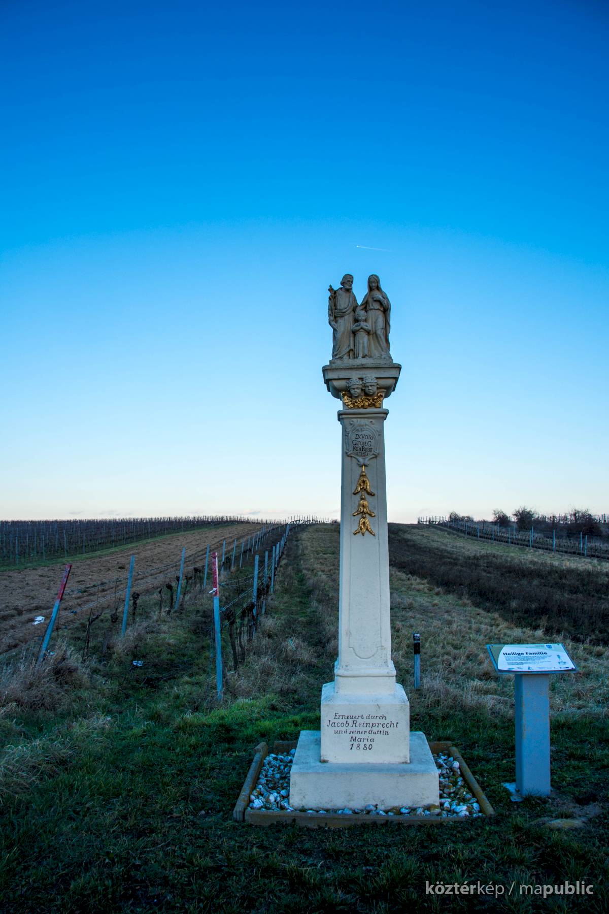 A fogadalmi, kerubfejekkel díszített Szentcsalád szobor 1751-ben készült az oszlopon olvasható felirat szerint.