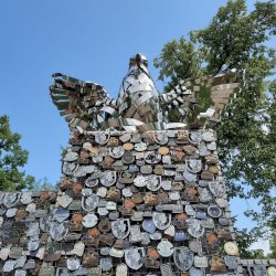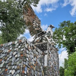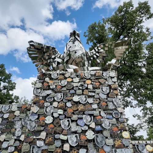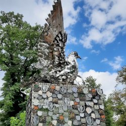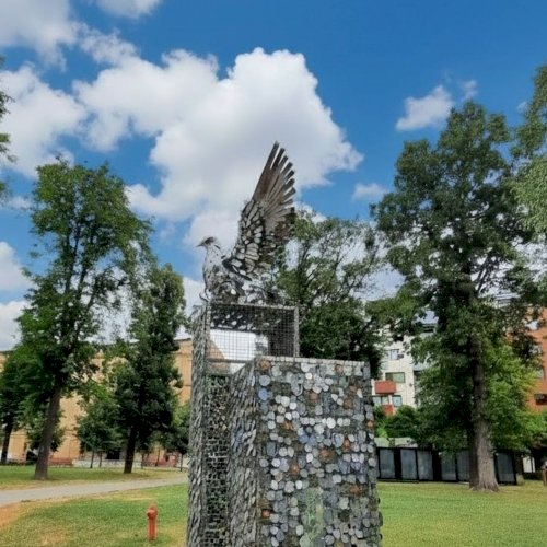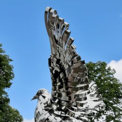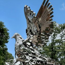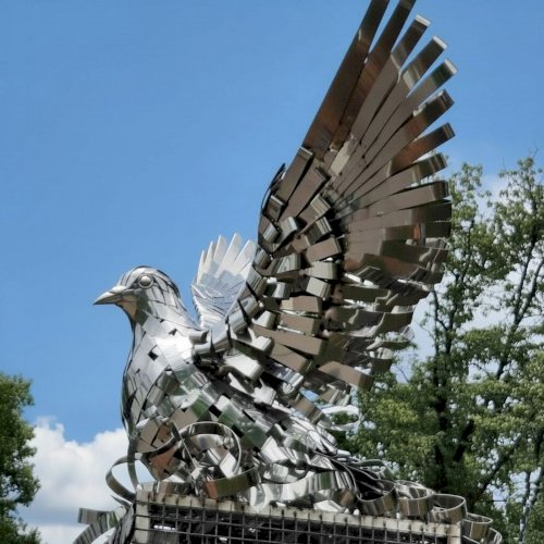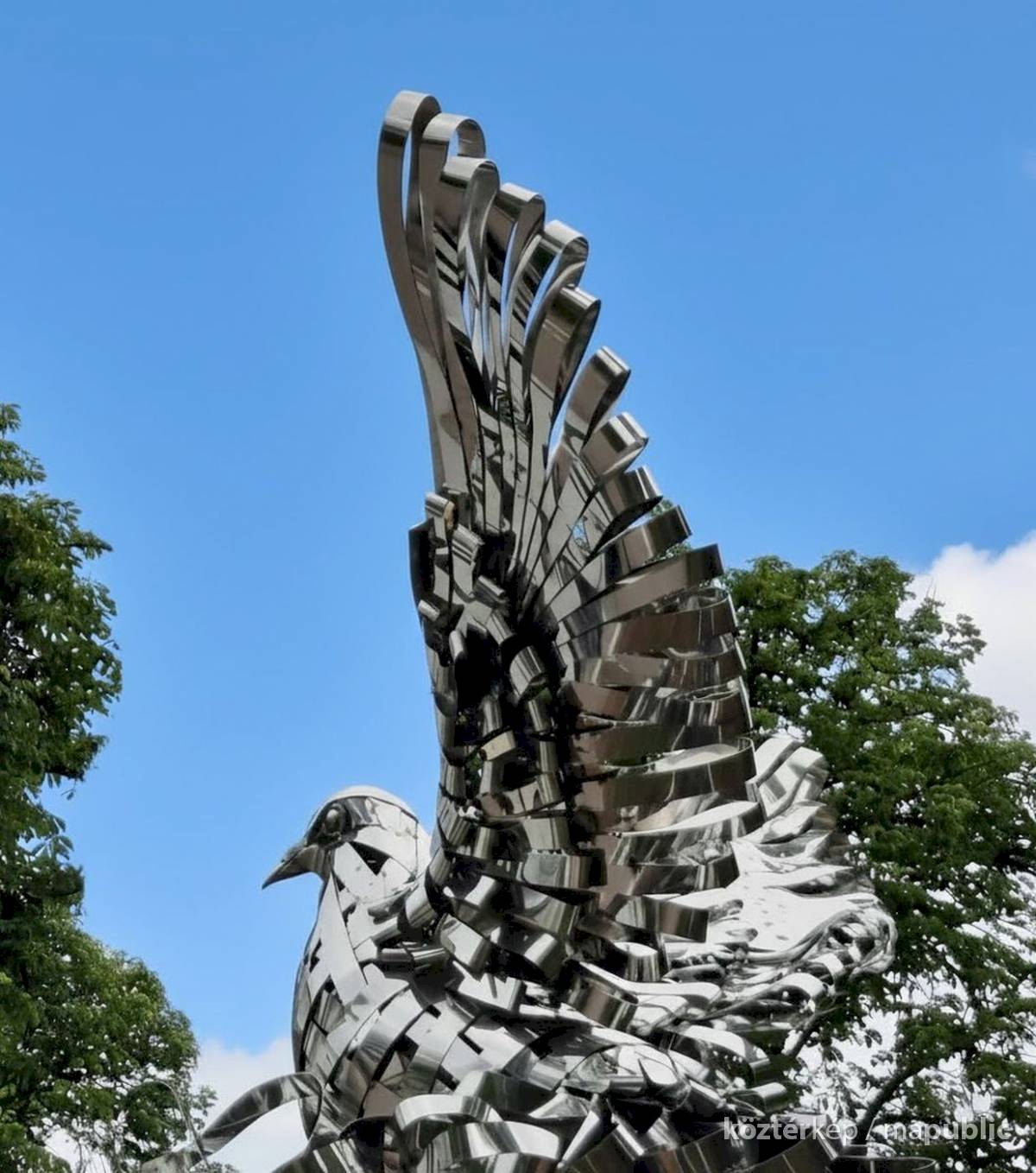 A galamb nem statikus állapotban van, a szárnyai szélesen kitárva, felfelé ívelnek. A rétegzett lemezek a tollazat mozgását imitálják, olyan érzetet keltve, mintha a madár épp a felszállás pillanatában lenne.
