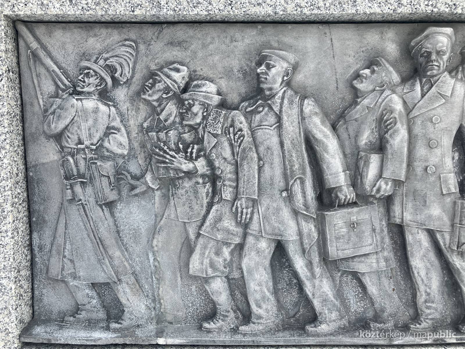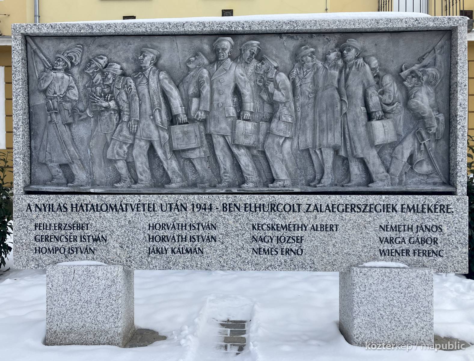 A szöveg: A NYILAS HATALOMÁTVÉTEL UTÁN 1944 - BEN ELHURCOLT ZALAEGERSZEGIEK EMLÉKÉRE. FEILI ERZSÉBET, GERENCSÉR ISTVÁN, HOMPÓ ISTVÁN, HORVÁTH ISTVÁN, HORVÁTH ISTVÁN, JÁKLY KÁLMÁN, KECSKEMÉTHY ALBERT, NAGY JÓZSEF, NEMES ERNŐ, NÉMETH JÁNOS, VARGA GÁBOR, WIENER FERENC[2]