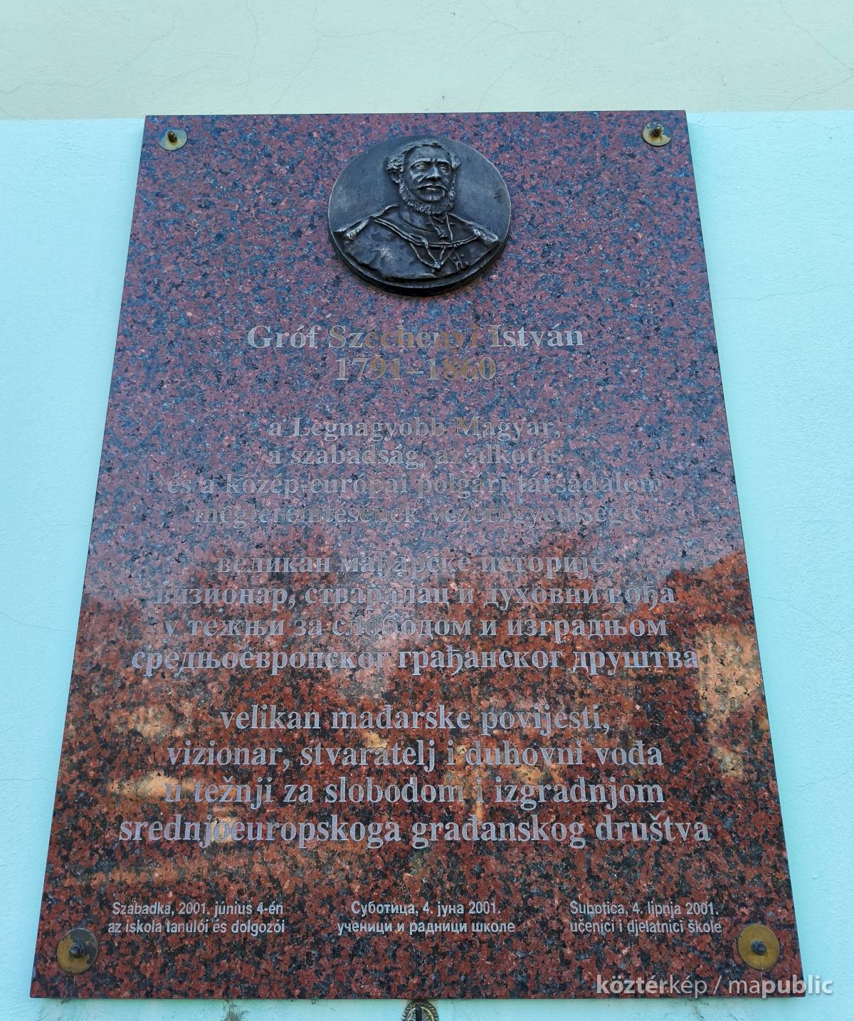 "Az iskola udvarában kerül sor erre a nagyszabású ünnepségre, amelyen mintegy 1000 személyre számítanak. Kasza József szerbiai kormányfőhelyettes leplezi le az itt elhelyezett emléktáblát, amelyen a dombormű - Széchenyi István képmása - Szarapka Tibor szobrászművészünk alkotása. A tanulók mindegyike egy kis írásos ismertetőt kap, amelyből megismerheti Széchenyi életét és munkásságát. " [1]