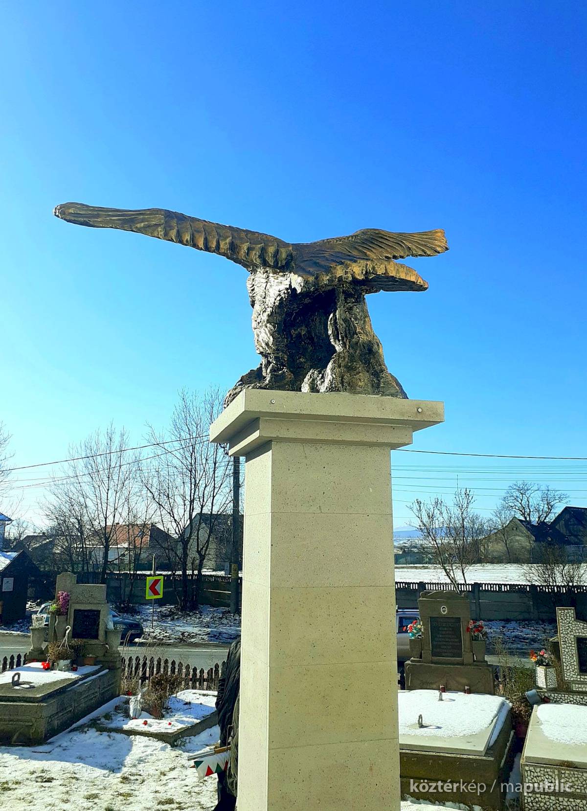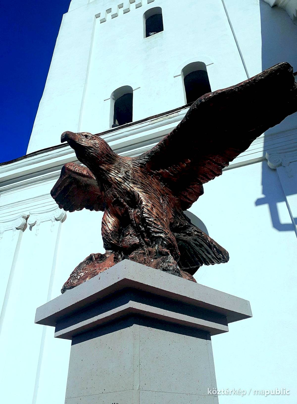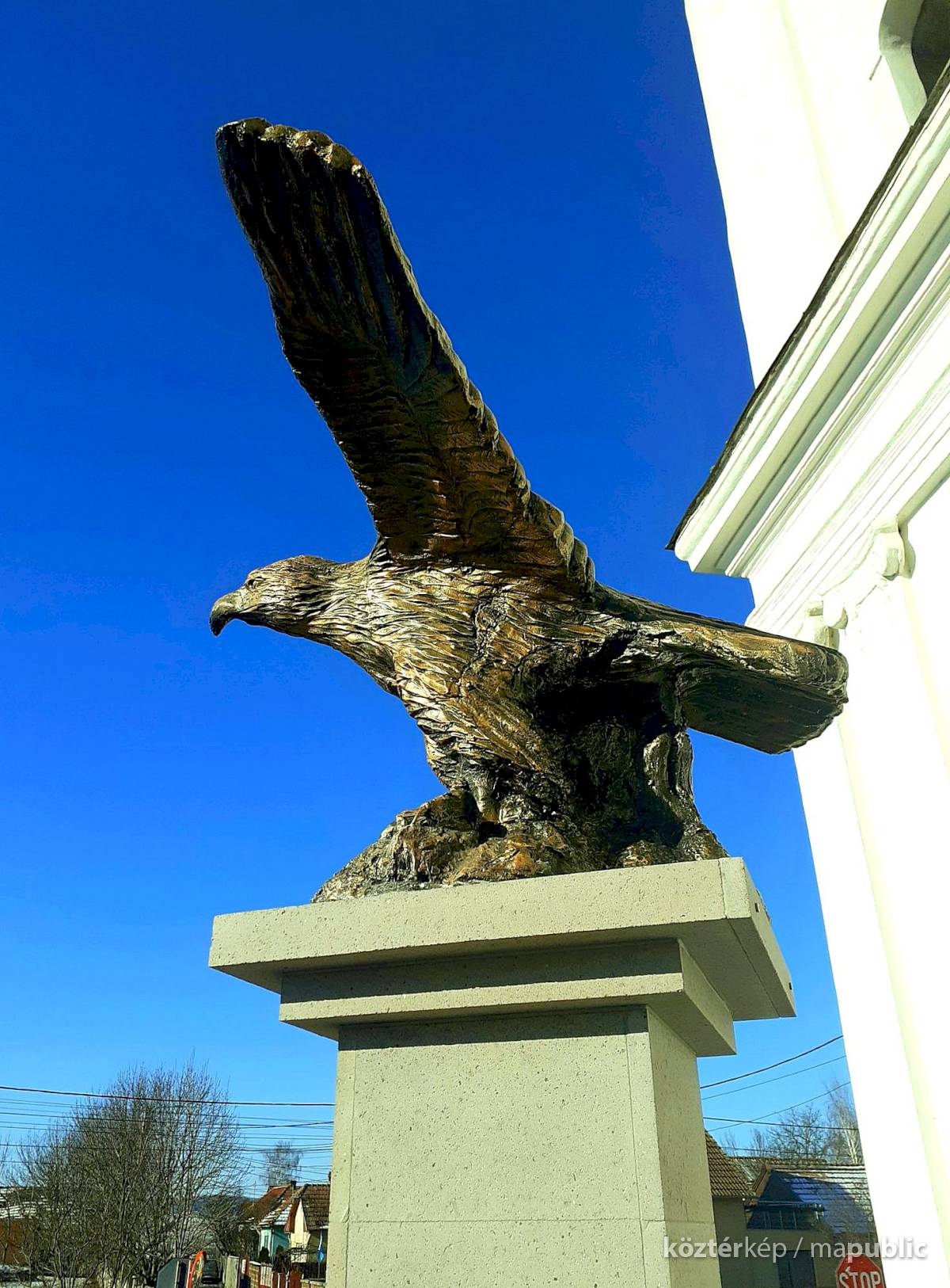 Egy sziklaszirten álló, szárnyait erőteljesen kitáró, fejét határozottan előre tartó, robusztos madár. A talapzat előoldalán ezek a felíratok olvashatók: "Az Isten könyörüljön rajtunk és áldjon meg minket. Zsolt. 67. 2a", valamint a "Zúgva száll, visszaszáll...". Ez utóbbi az Ott, ahol zúg a négy folyó közismert hazafias dalból származó idézet.