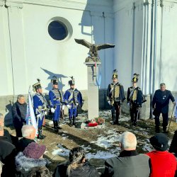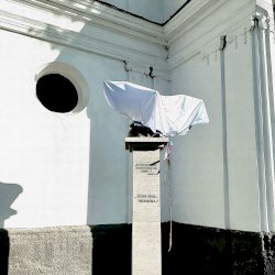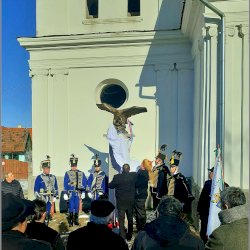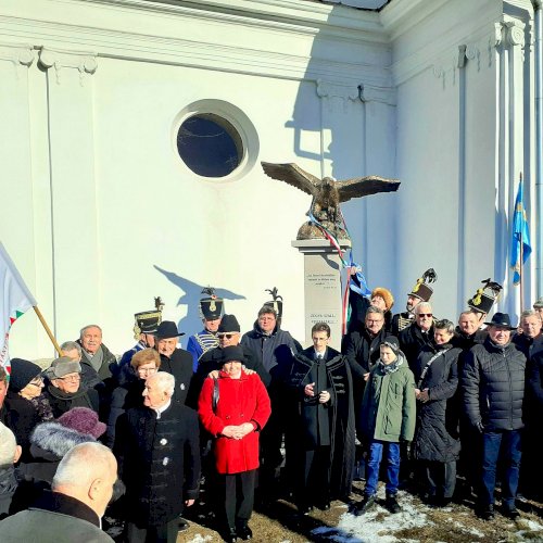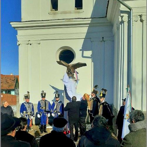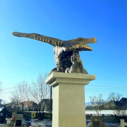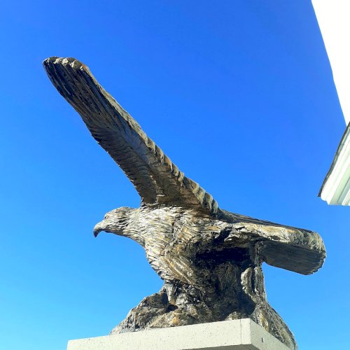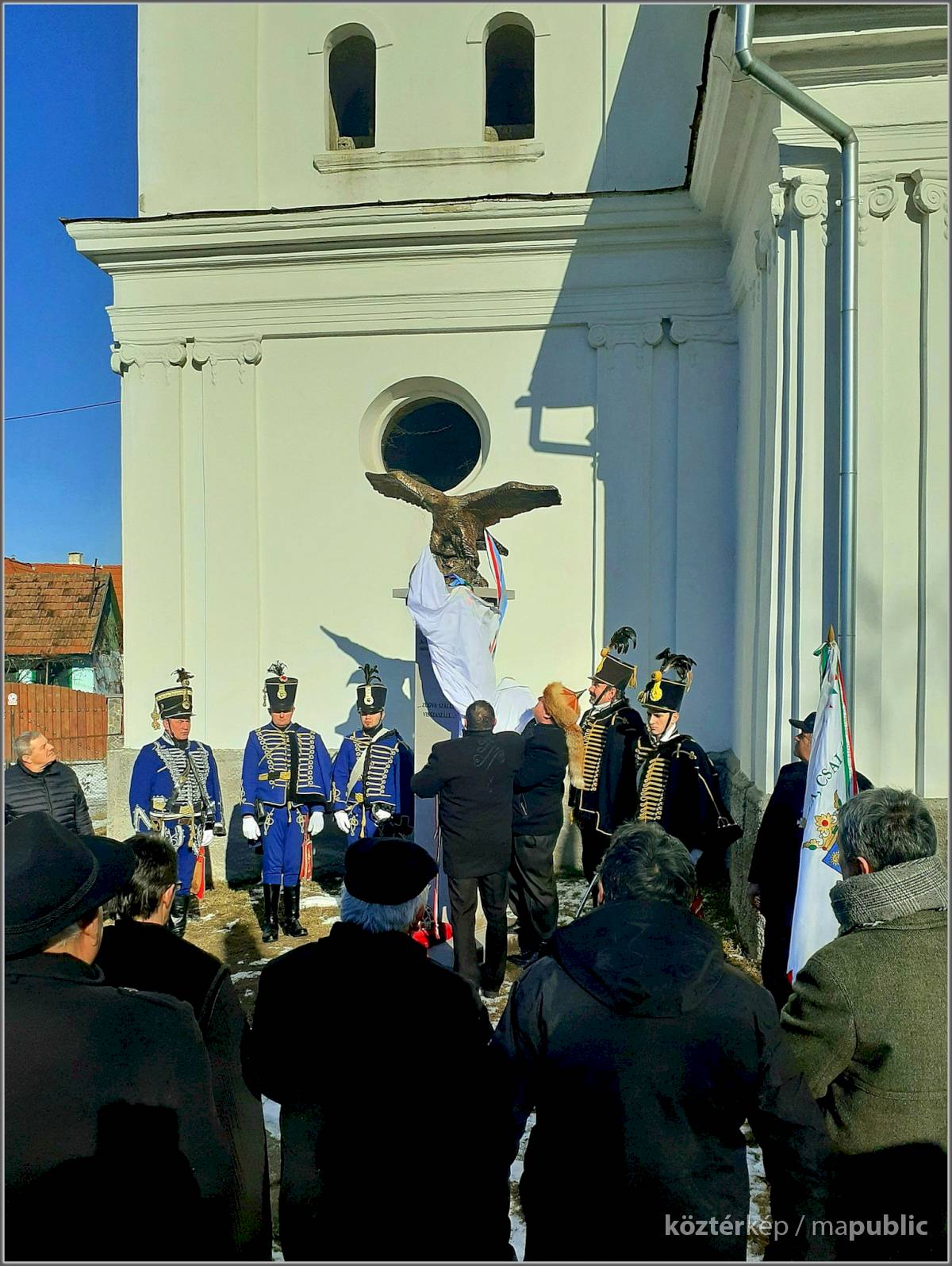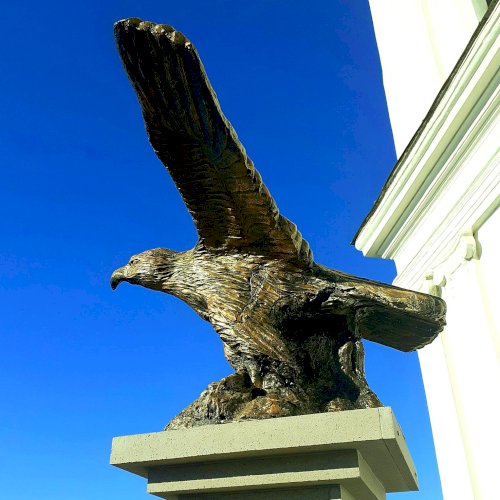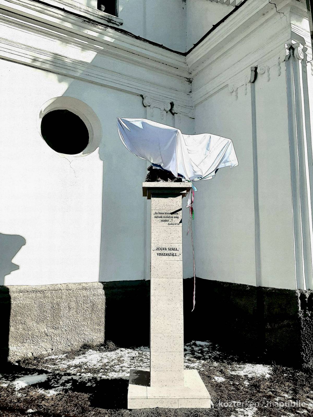 Egy sziklaszirten álló, szárnyait erőteljesen kitáró, fejét határozottan előre tartó, robusztos madár. A talapzat előoldalán ezek a felíratok olvashatók: "Az Isten könyörüljön rajtunk és áldjon meg minket. Zsolt. 67. 2a", valamint a "Zúgva száll, visszaszáll...". Ez utóbbi az Ott, ahol zúg a négy folyó közismert hazafias dalból származó idézet.
