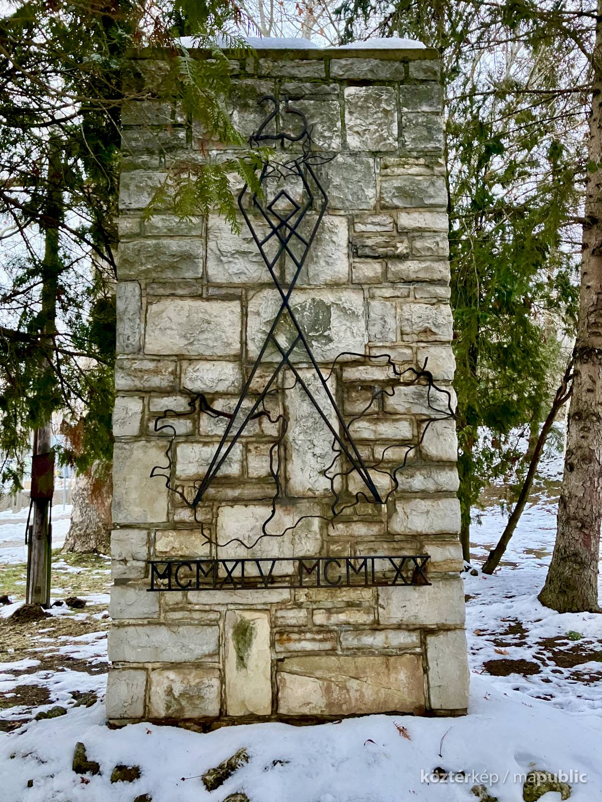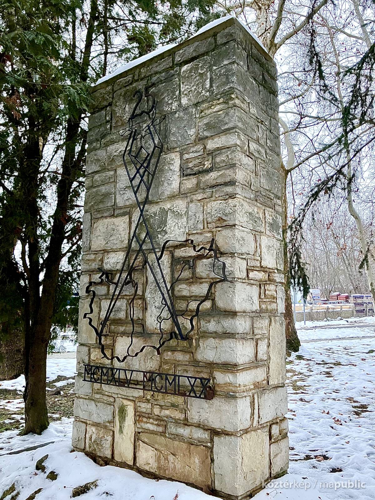 A Sallai Imre és a Kossuth Lajos utcák találkozásánál a körforgalommal szemben kialakított Tabi (másként Szabadság) park fáinak takarásában áll ez a 25 / MCMXLV MCMLXX feliratos, Magyarország felszabadulásának 25. évfordulója tiszteletére készített emlékmű, melyen hajlított vasból készült, szimbolikus jelentésű stilizalt alak, és Magyarország térkép körvonala látható.