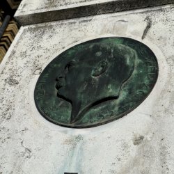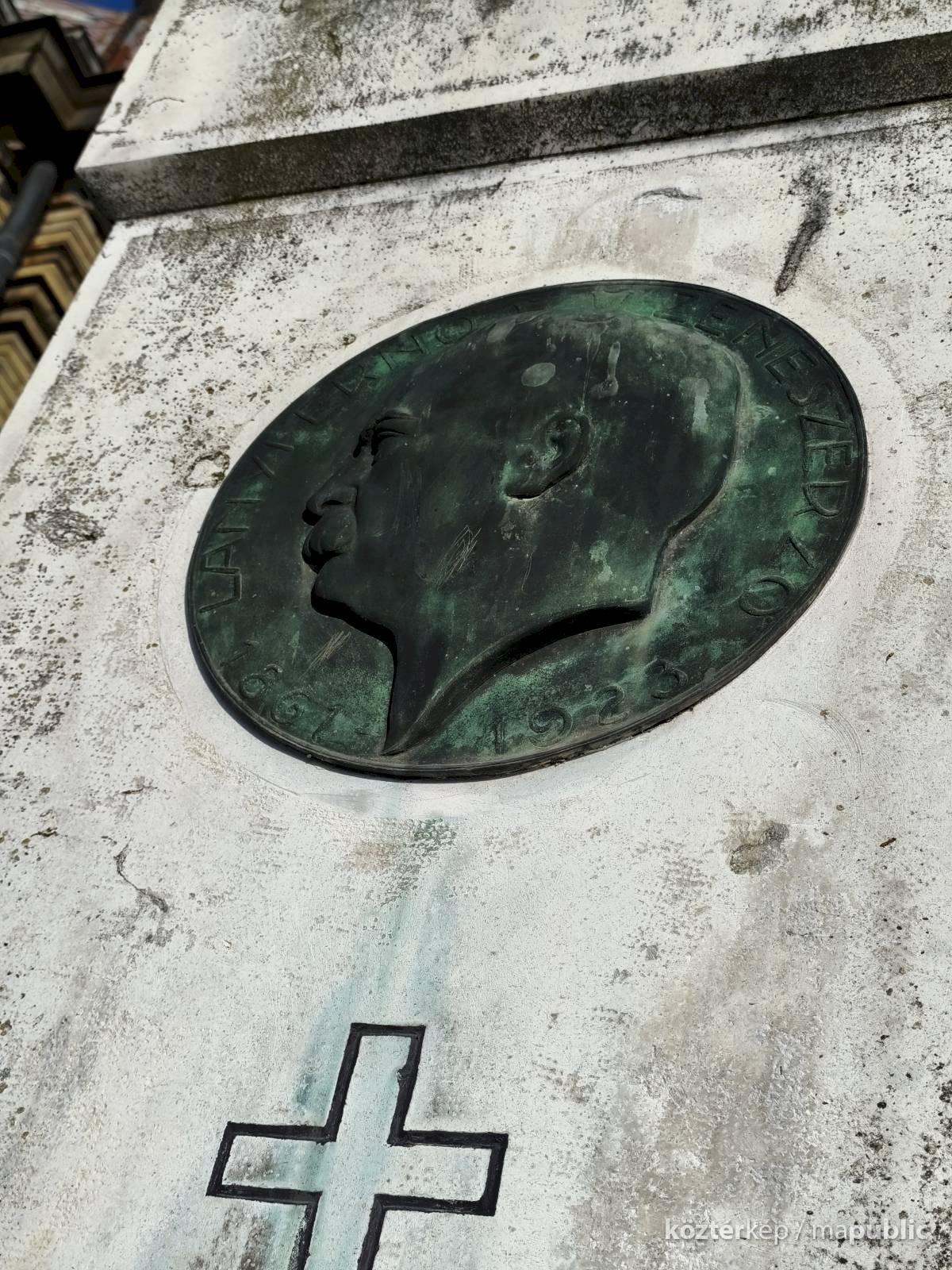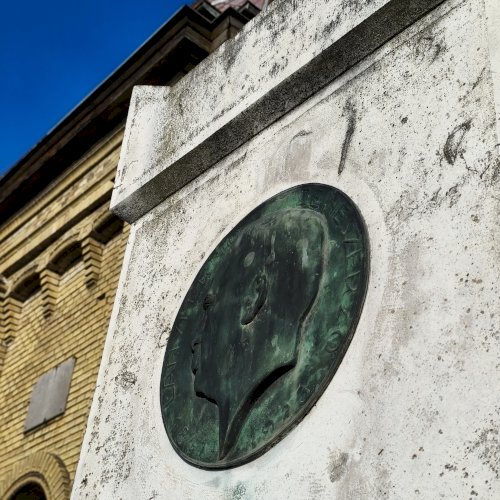 Fehér mészkőből faragott torony szerű síremlék fejrészén, középen egy bronzból készült profil portré látható. Másolata a róla elnevezett belvárosi zeneiskola külső falán látható. (Kapcsolt műlapon.)