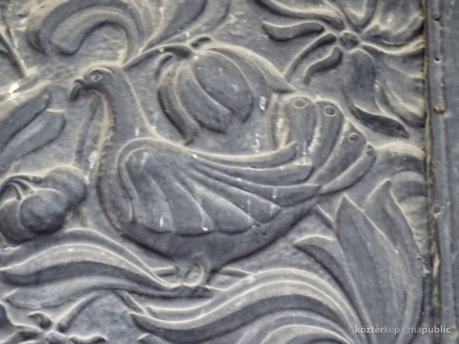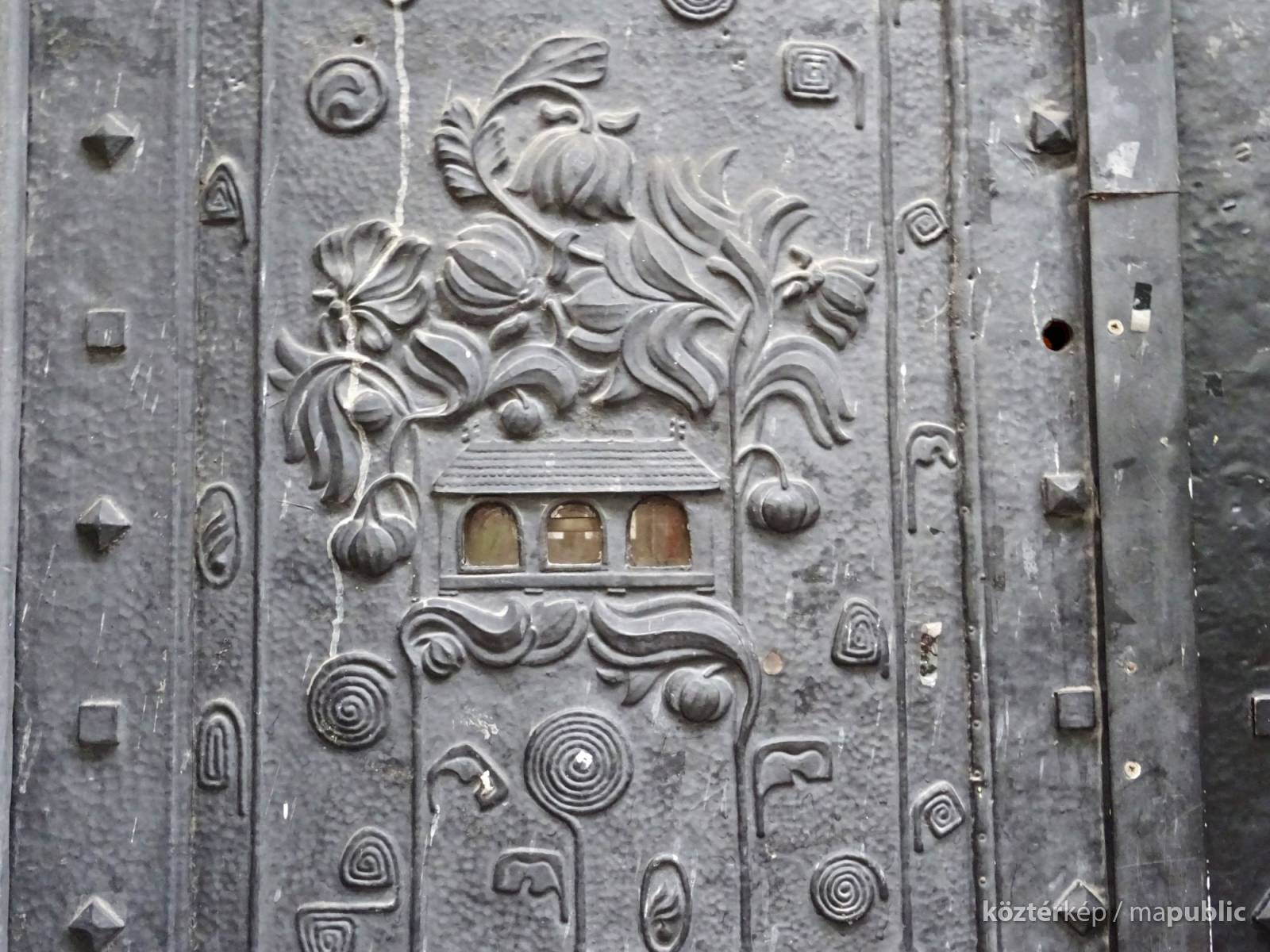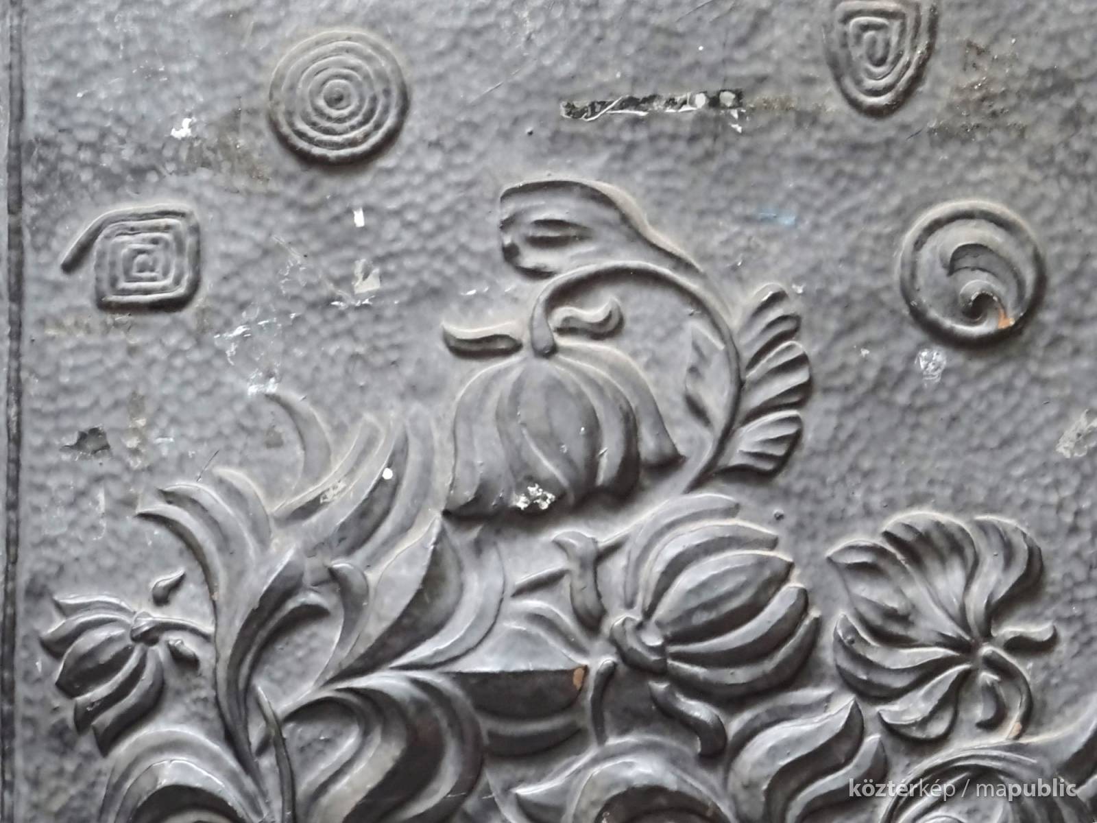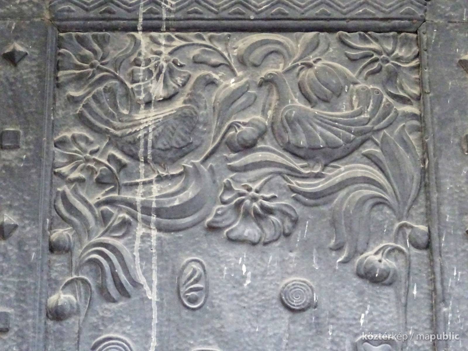 Nincs semmilyen adat viszont a kapu díszítéséről, készítőjéről. Szignót, jelzést nem találtam. Pedig igazi szecessziós munka: virágok és geometrikus díszeknek mondható apró, de jellegzetes szecessziós motívumok között (ill. felett) mindkét szárnyom egymás felé forduló két-két gerlepár jelenik meg. A körülöttük lévő virágok stílusukban megintcsak jellegzetes motívumok.