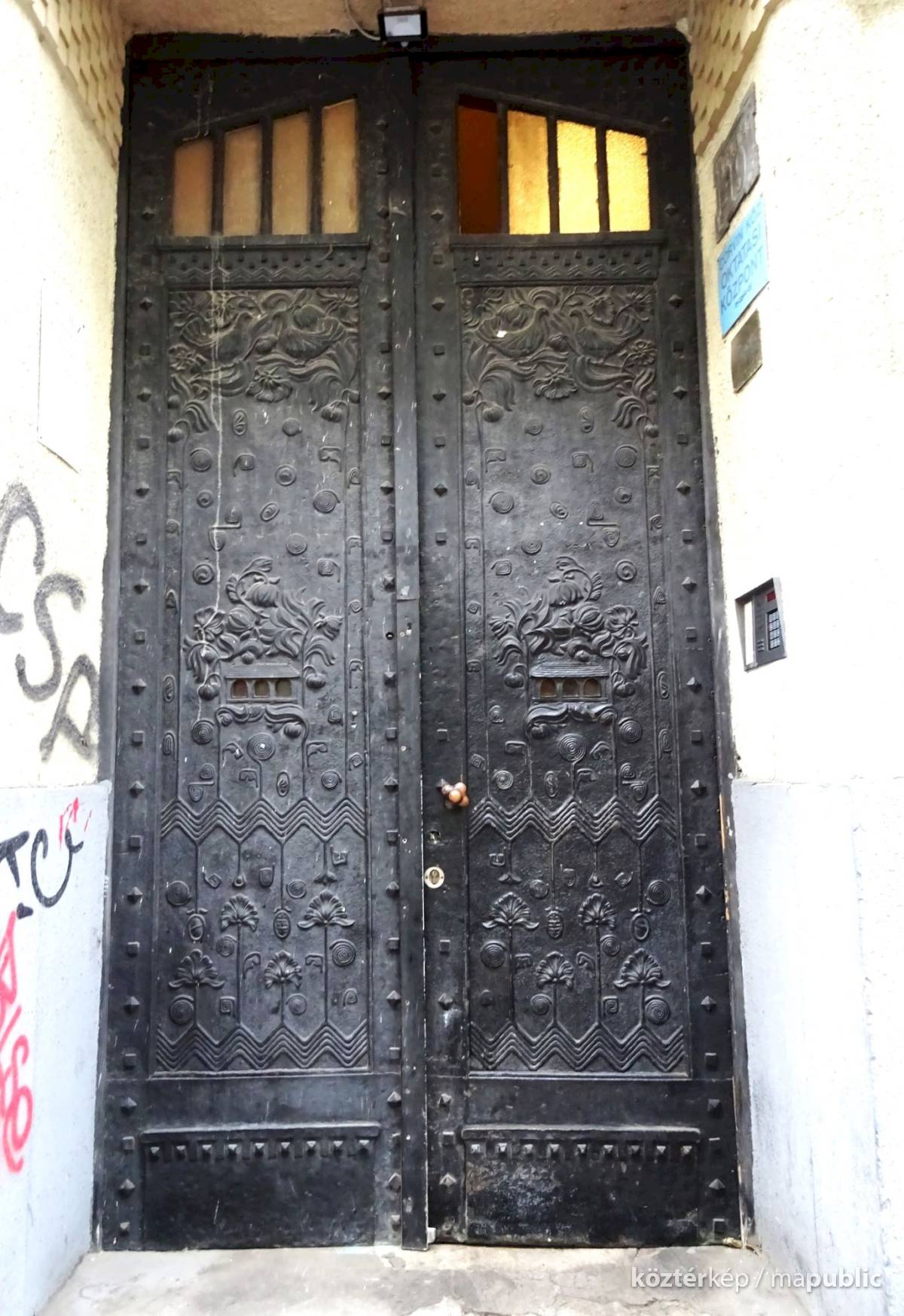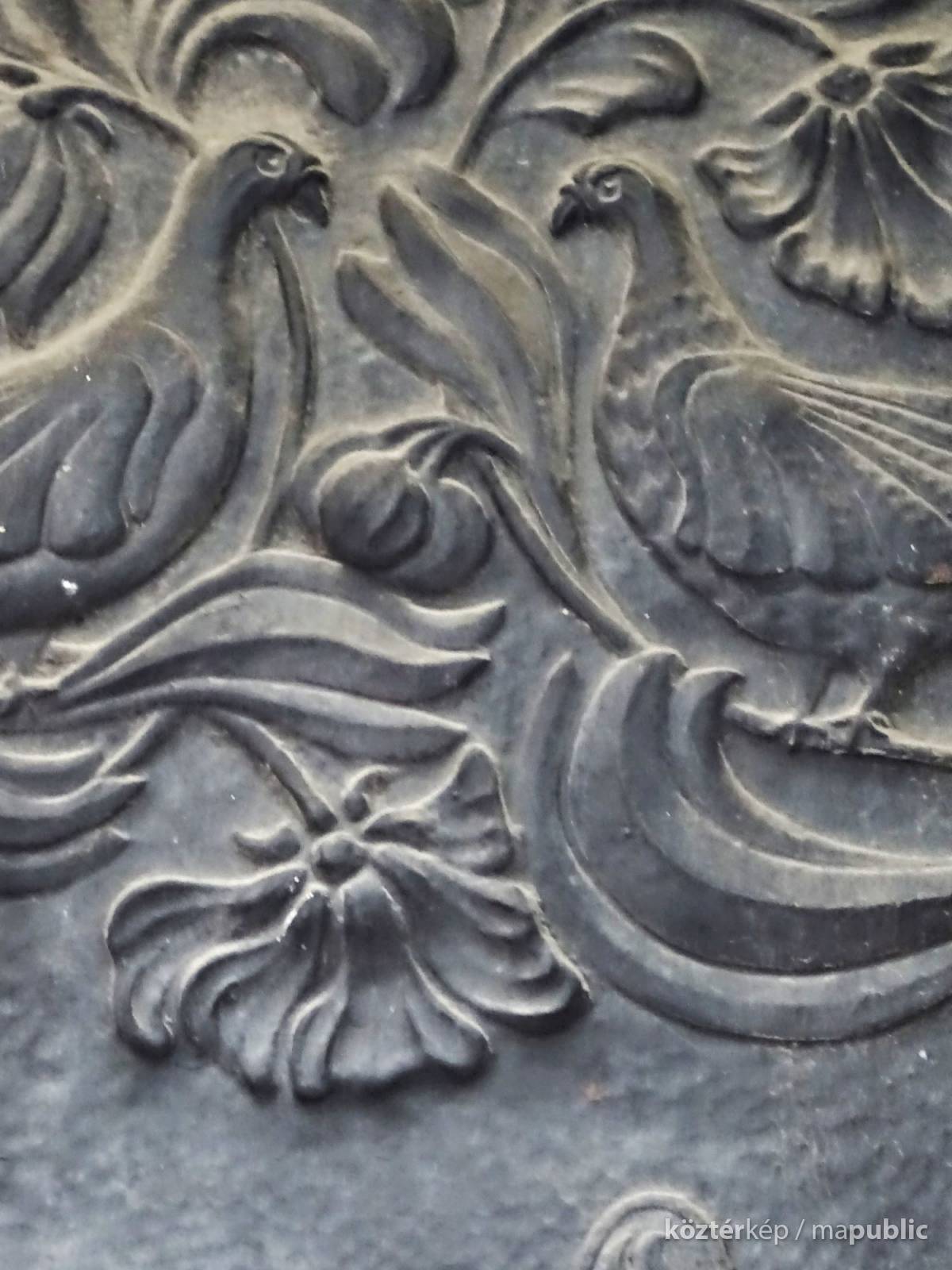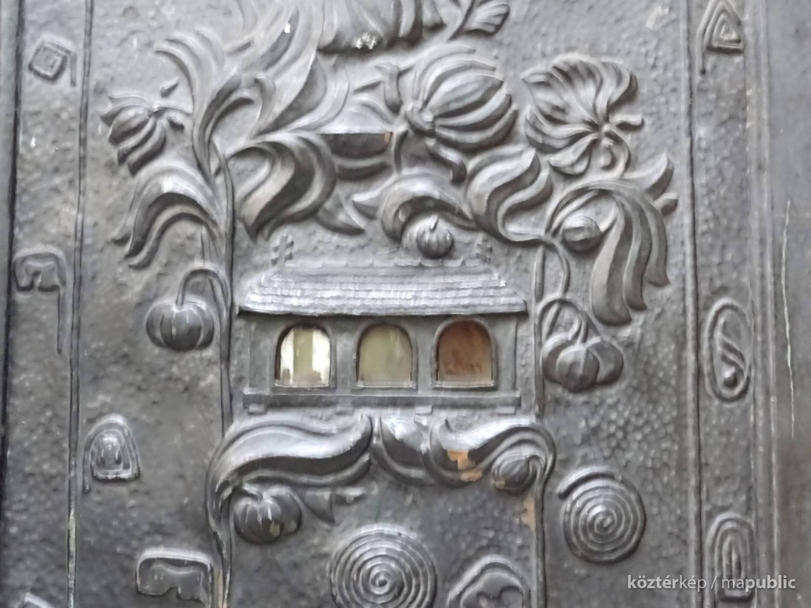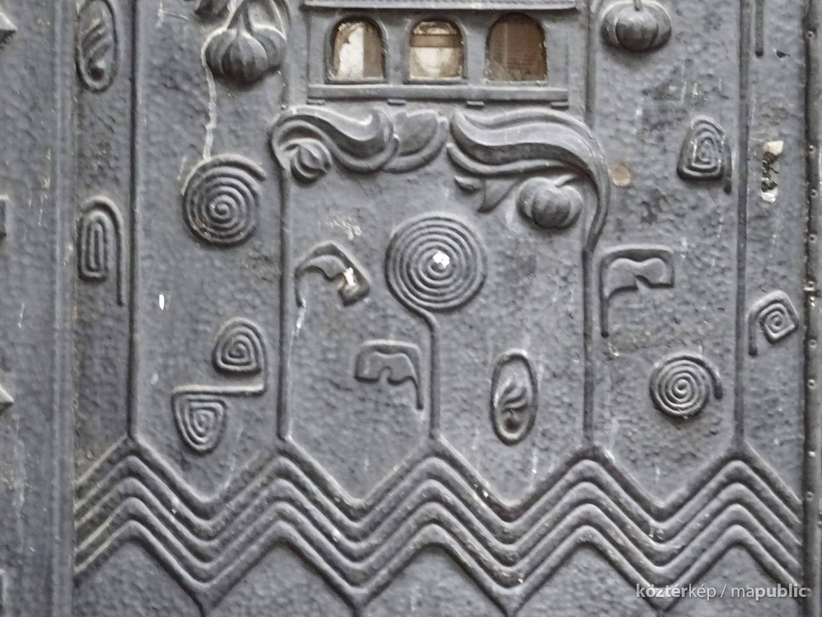 Nincs semmilyen adat viszont a kapu díszítéséről, készítőjéről. Szignót, jelzést nem találtam. Pedig igazi szecessziós munka: virágok és geometrikus díszeknek mondható apró, de jellegzetes szecessziós motívumok között (ill. felett) mindkét szárnyom egymás felé forduló két-két gerlepár jelenik meg. A körülöttük lévő virágok stílusukban megintcsak jellegzetes motívumok.