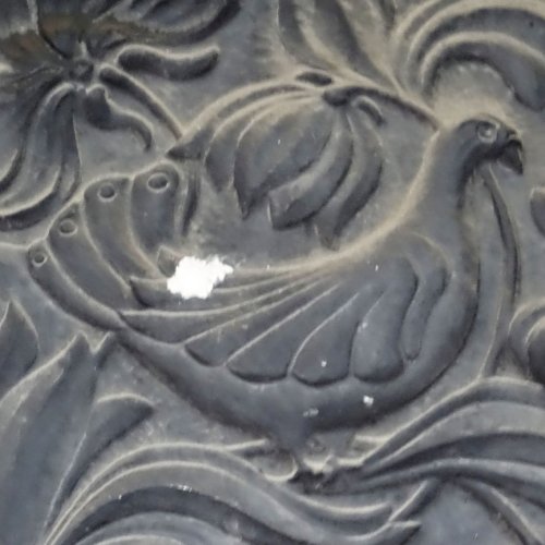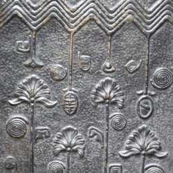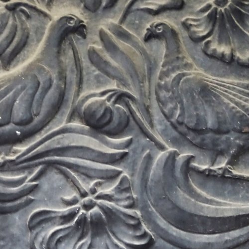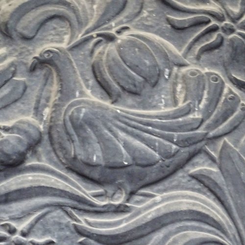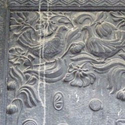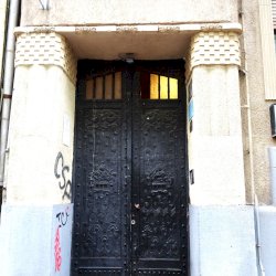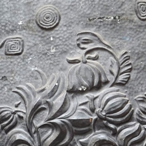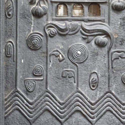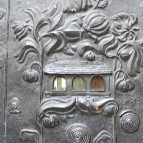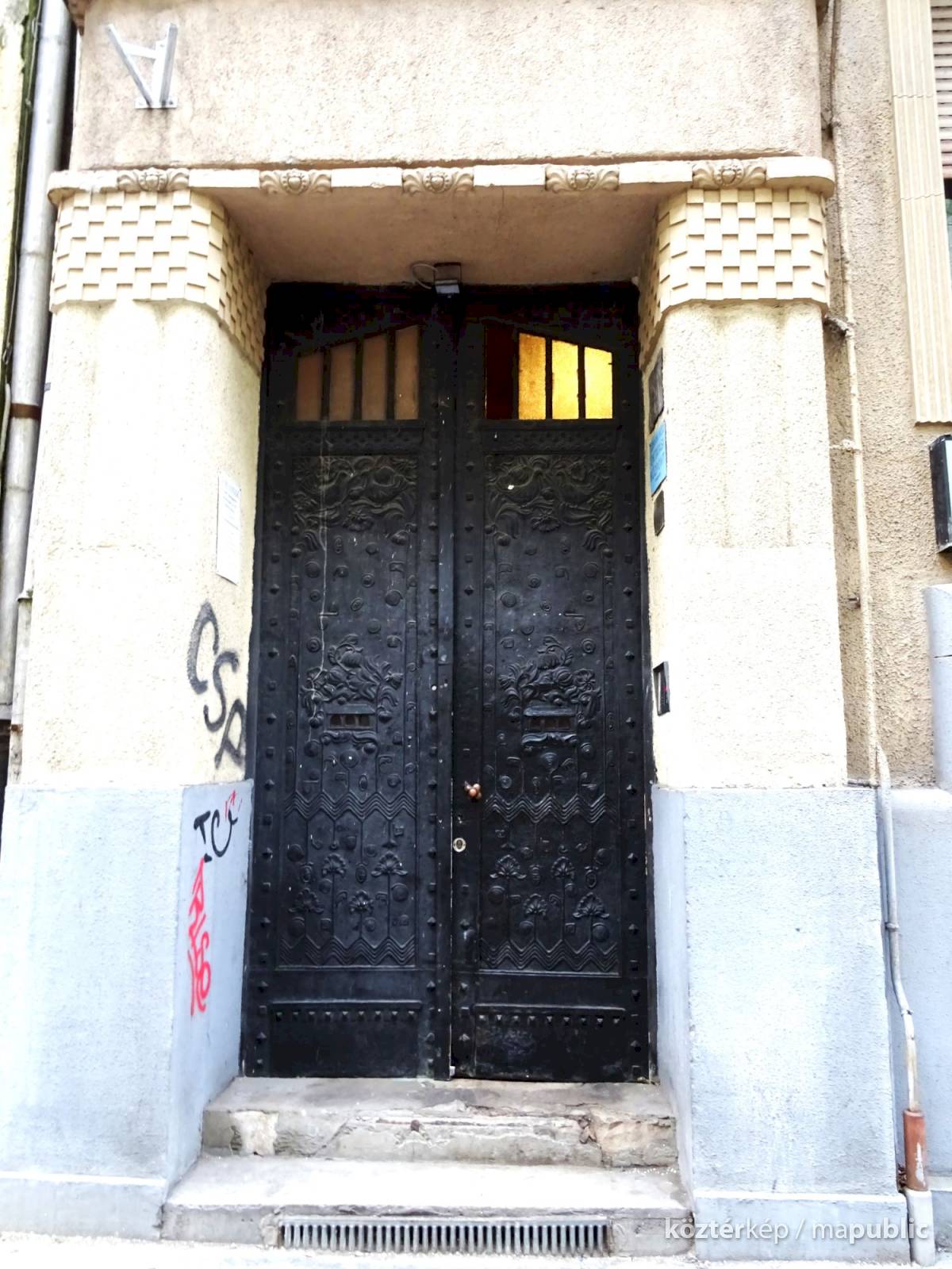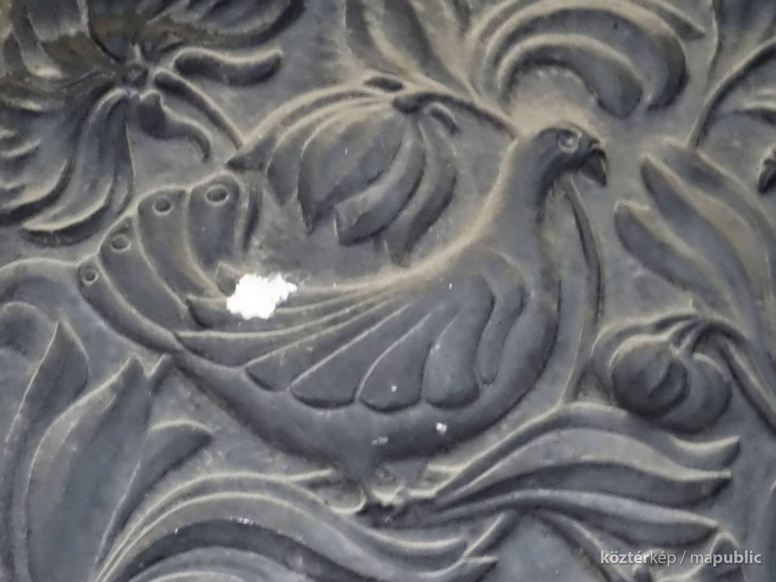 Nincs semmilyen adat viszont a kapu díszítéséről, készítőjéről. Szignót, jelzést nem találtam. Pedig igazi szecessziós munka: virágok és geometrikus díszeknek mondható apró, de jellegzetes szecessziós motívumok között (ill. felett) mindkét szárnyom egymás felé forduló két-két gerlepár jelenik meg. A körülöttük lévő virágok stílusukban megintcsak jellegzetes motívumok.