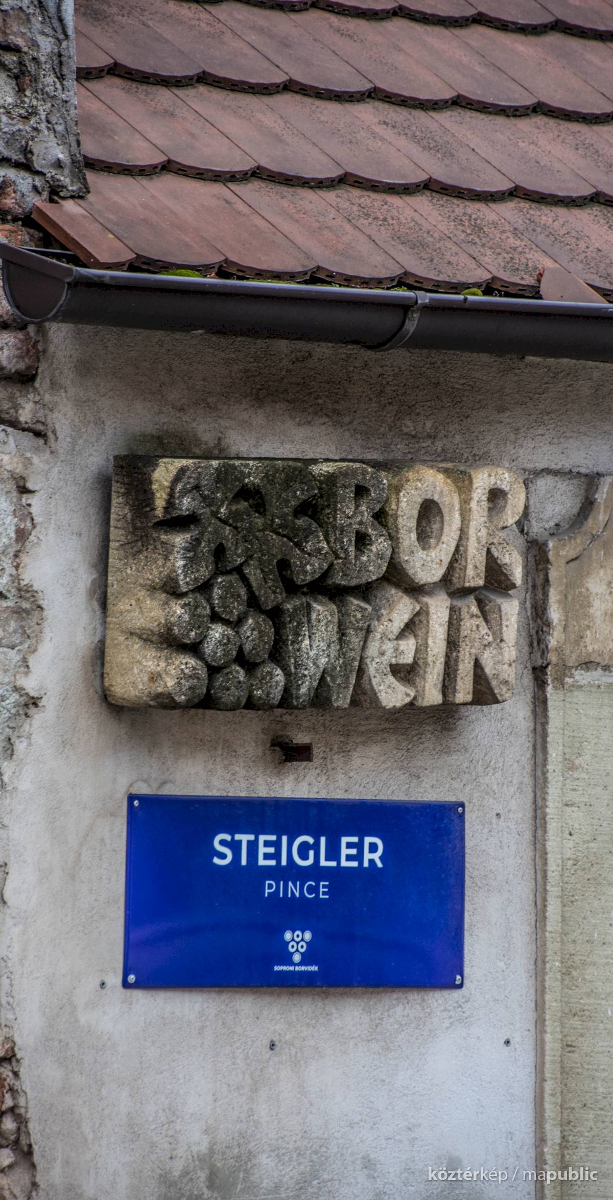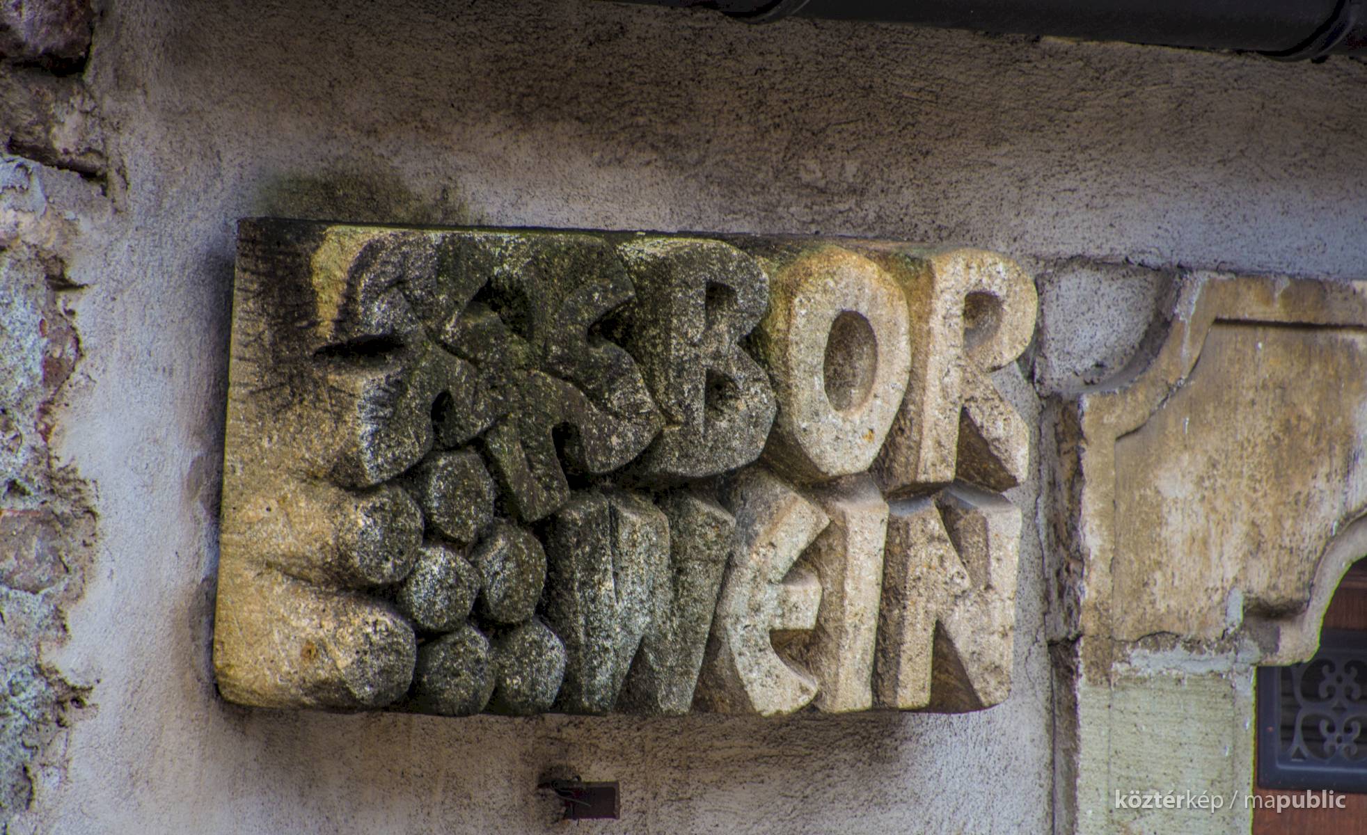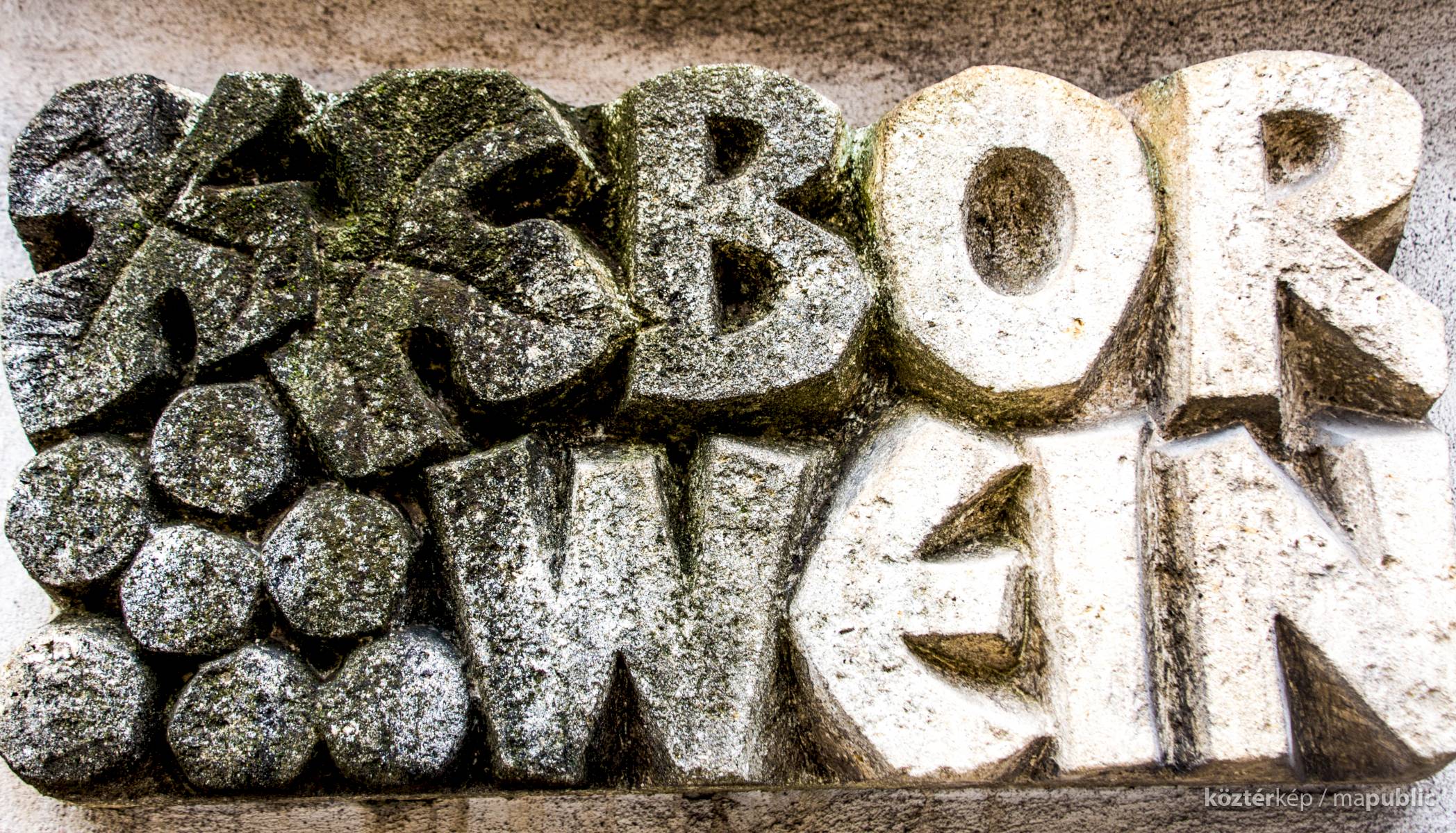 A borospince cégére egy nagyméretű mészkő, mely magyarul és németül hirdeti: "Bor / Wein - azaz „Bort iszunk mi, ugye, pajtás?”[2]