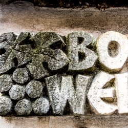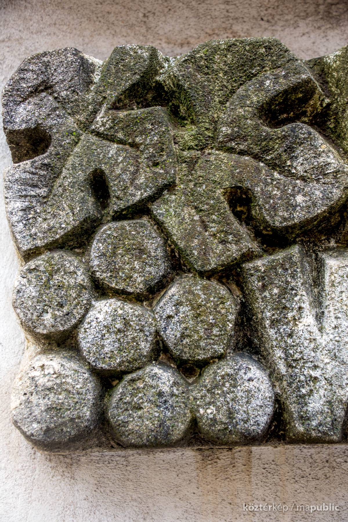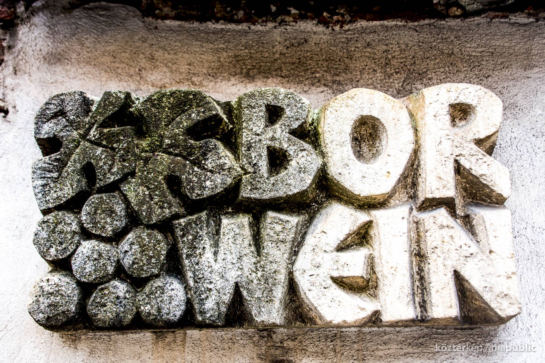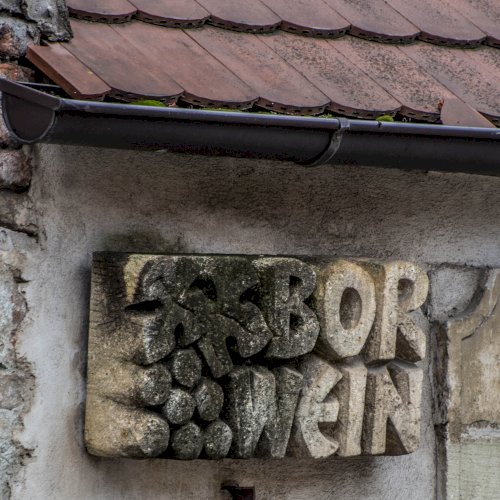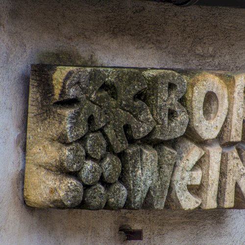 A borospince cégére egy nagyméretű mészkő, mely magyarul és németül hirdeti: "Bor / Wein - azaz „Bort iszunk mi, ugye, pajtás?”[2]