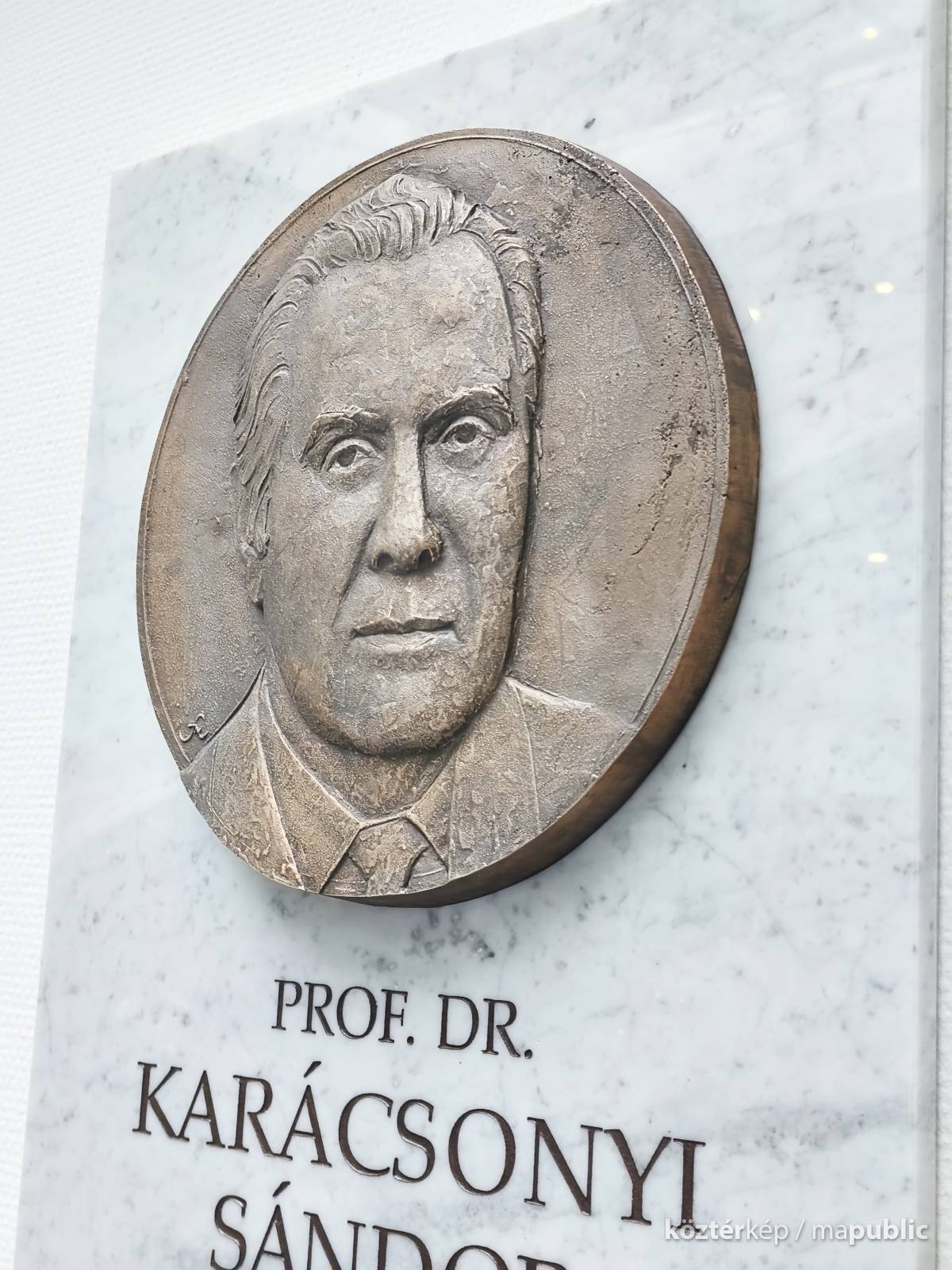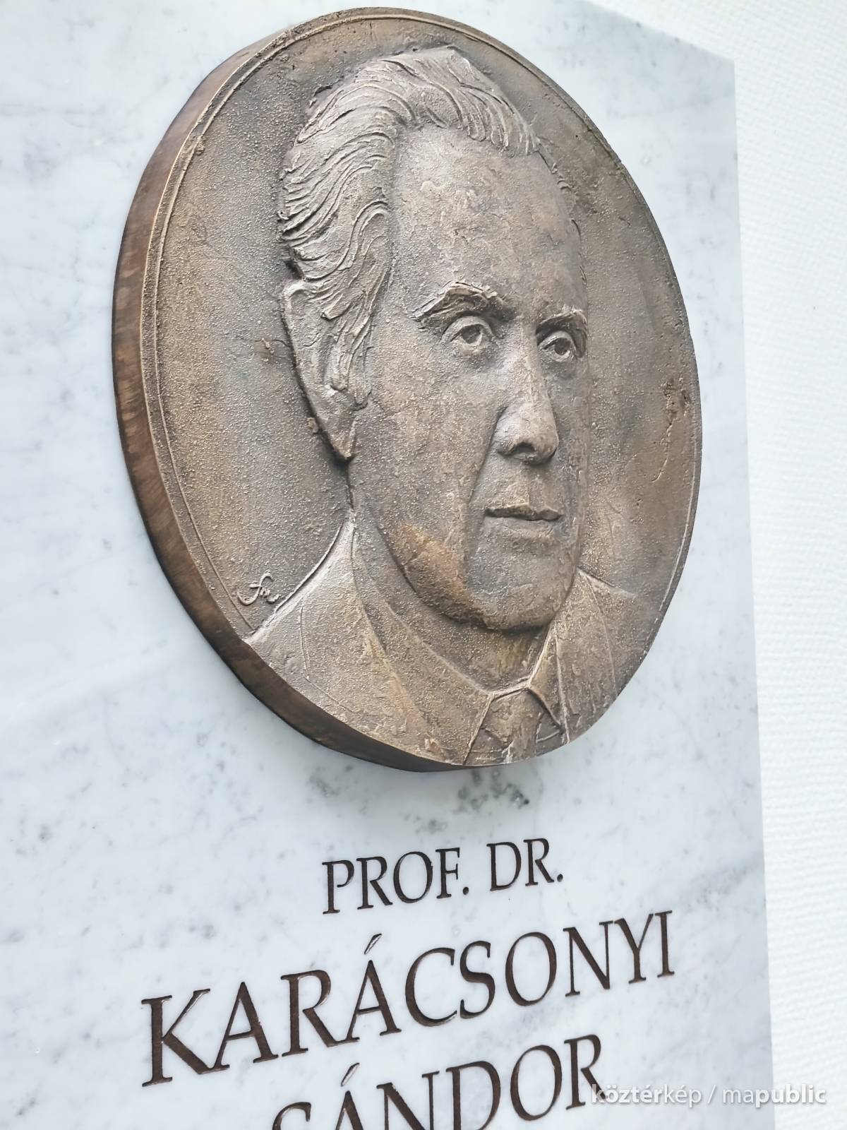 A szegedi Szent-Györgyi Albert Klinikai Központ Belgyógyászati Klinika és Kardiológiai Központban. Petri Gábor klinikai tömb, magasföldszinti aulájában a bal oldali falon, (több híres orvos-portré társaságában) látható, Karácsonyi Sándor professzor az egykori igazgató sebészfőorvos (1982-1992) domborműves emléktáblája. Márványtábla felső részén, harminc centi átmérőjű bronz portré, Fritz Mihály szobrász alkotása látható, alatta emlékező szöveg olvasható. Együtt avatták professzor társa Dr. Balogh Ádám, és Dr. Kovács Gábor emléktáblájával.