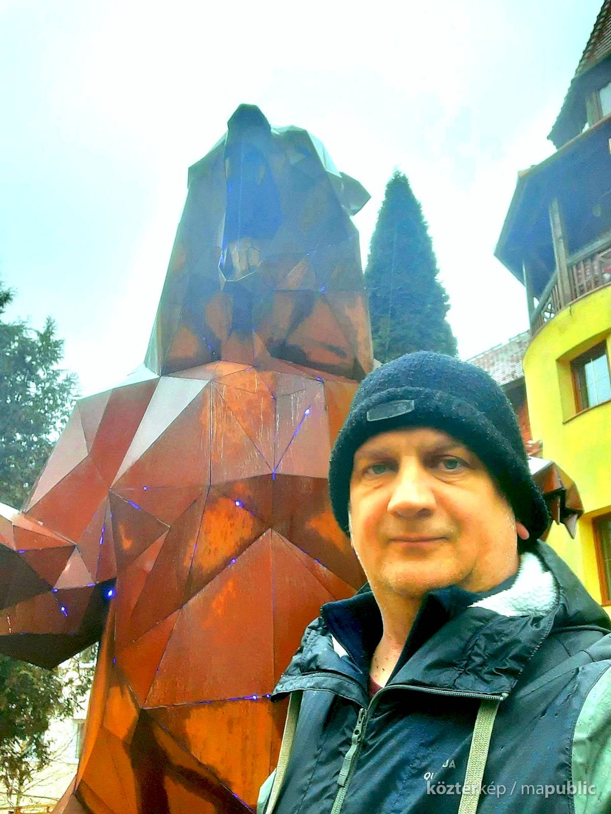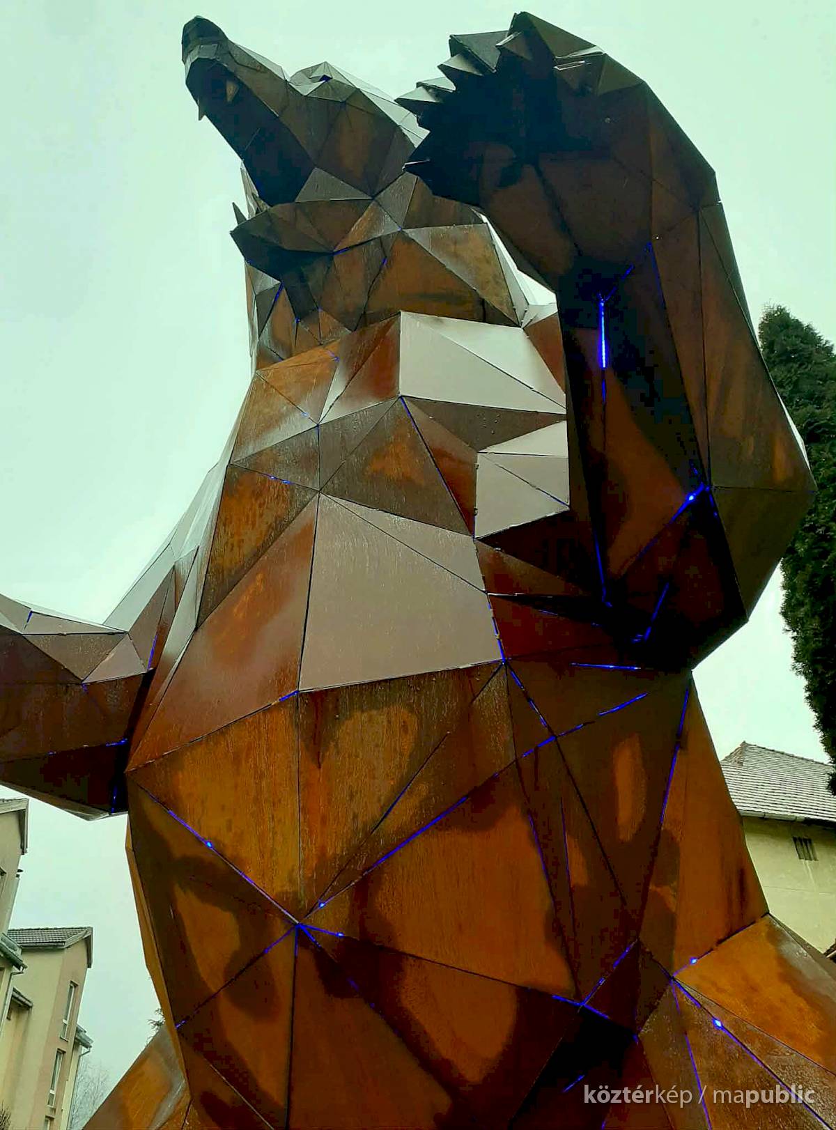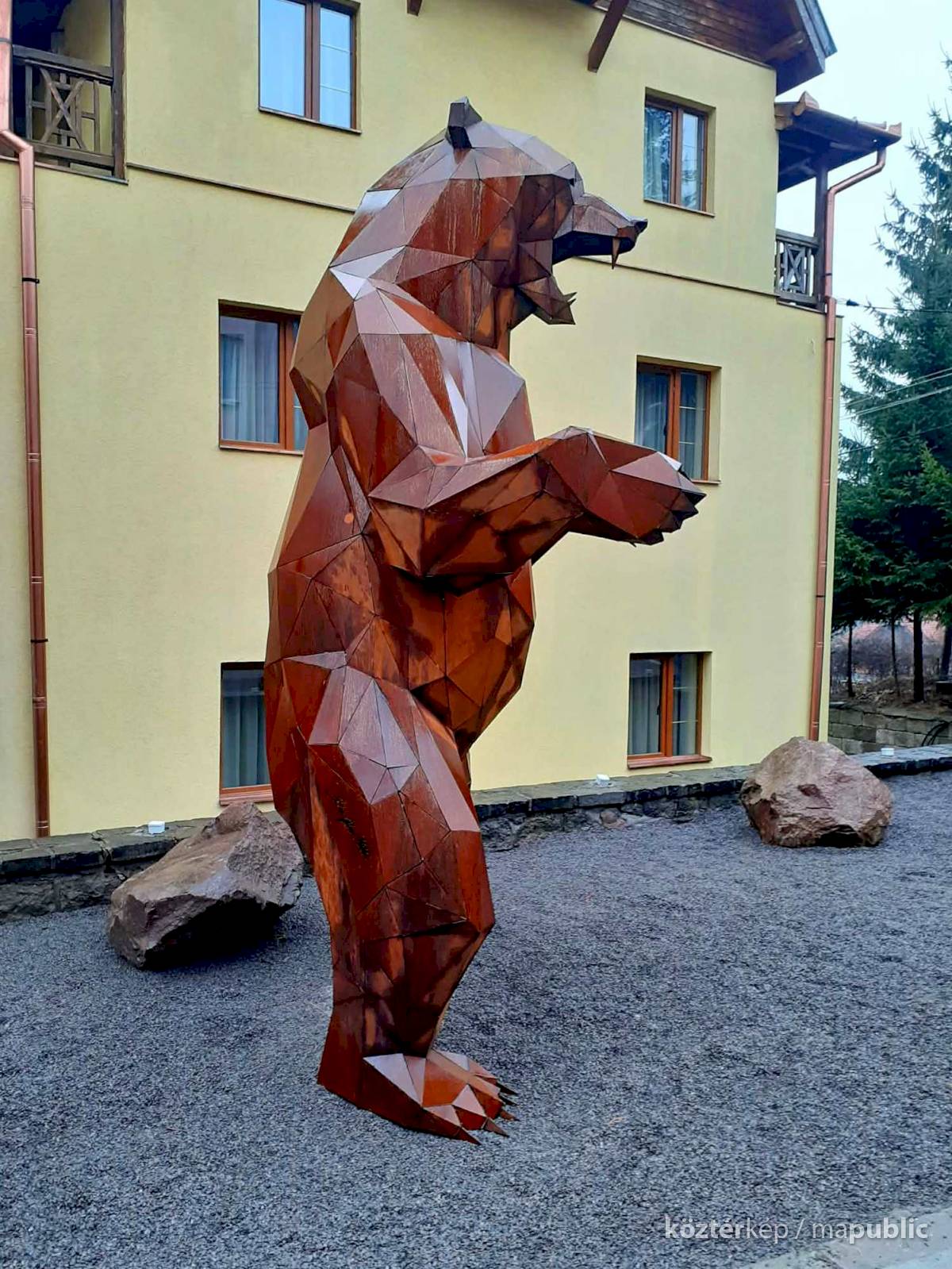 Az avatás után négy nappal sikerült felkeresnem a monumentálisnak mondható fémszobrot, sajnos kissé esős, borongós időben. Amikor, a forgalmas vendégházból látták, hogy érdeklődően fotózom az amugy is turistacsalogatónak szánt művet, akkor, az épületből felkapcsolták a medve testében lévő, váltakozó szines fényeket, melyek a fémelemek közötti réseken kiszűrődve érvényesülnek, közvetítenek hangulatot nem csak éjszaka de még a nappali időszakban is.