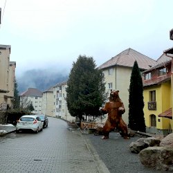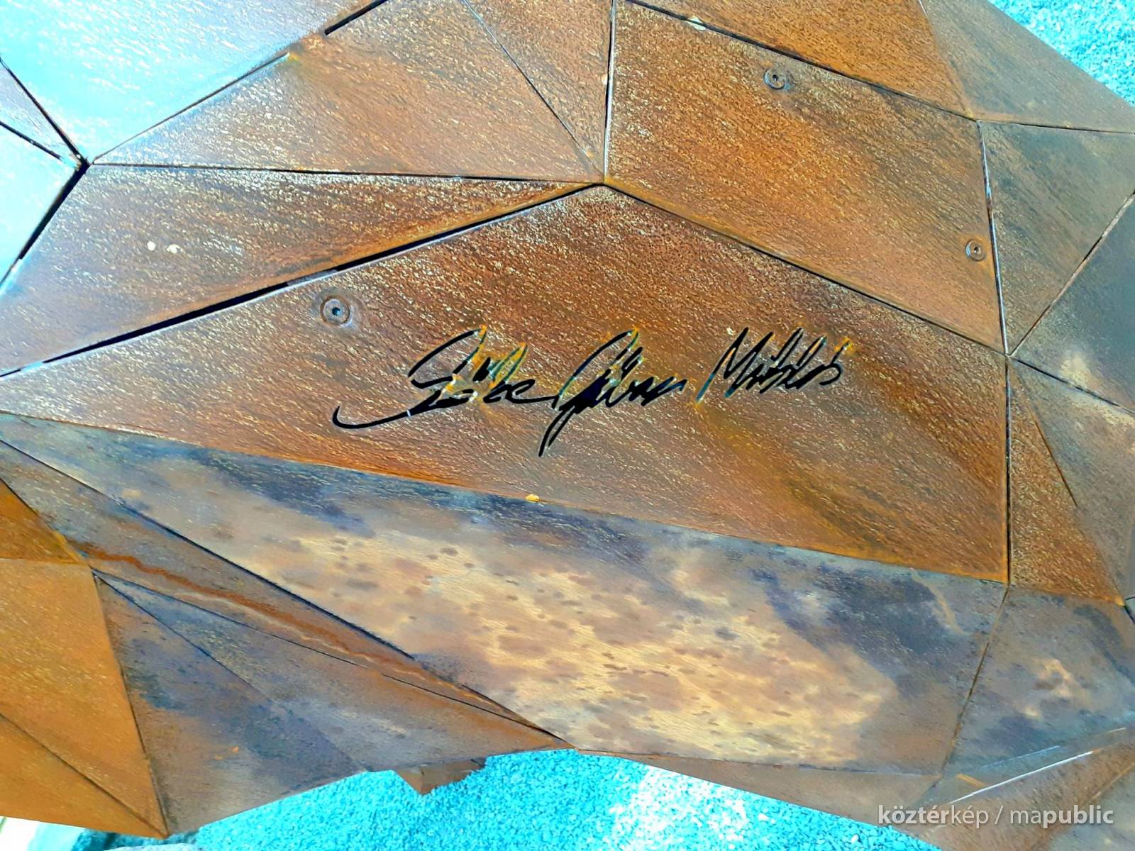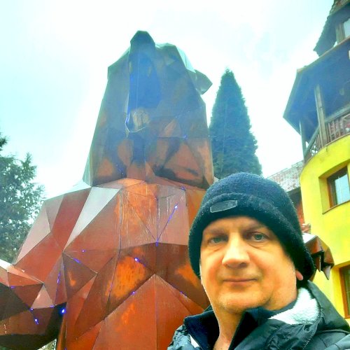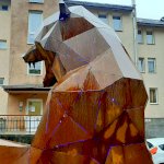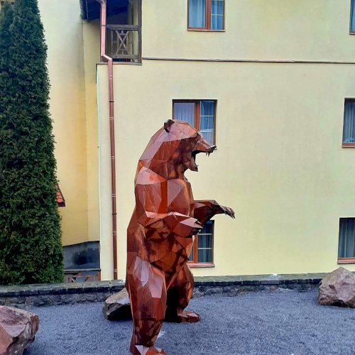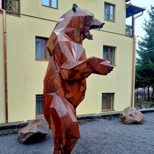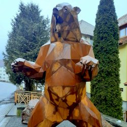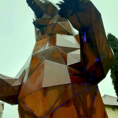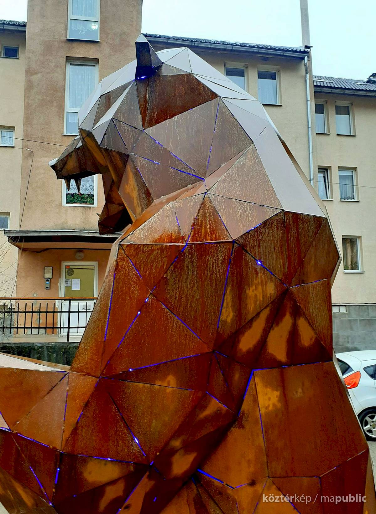 Az avatás után négy nappal sikerült felkeresnem a monumentálisnak mondható fémszobrot, sajnos kissé esős, borongós időben. Amikor, a forgalmas vendégházból látták, hogy érdeklődően fotózom az amugy is turistacsalogatónak szánt művet, akkor, az épületből felkapcsolták a medve testében lévő, váltakozó szines fényeket, melyek a fémelemek közötti réseken kiszűrődve érvényesülnek, közvetítenek hangulatot nem csak éjszaka de még a nappali időszakban is.