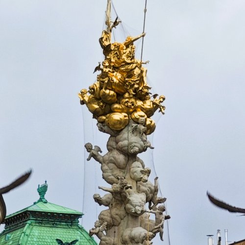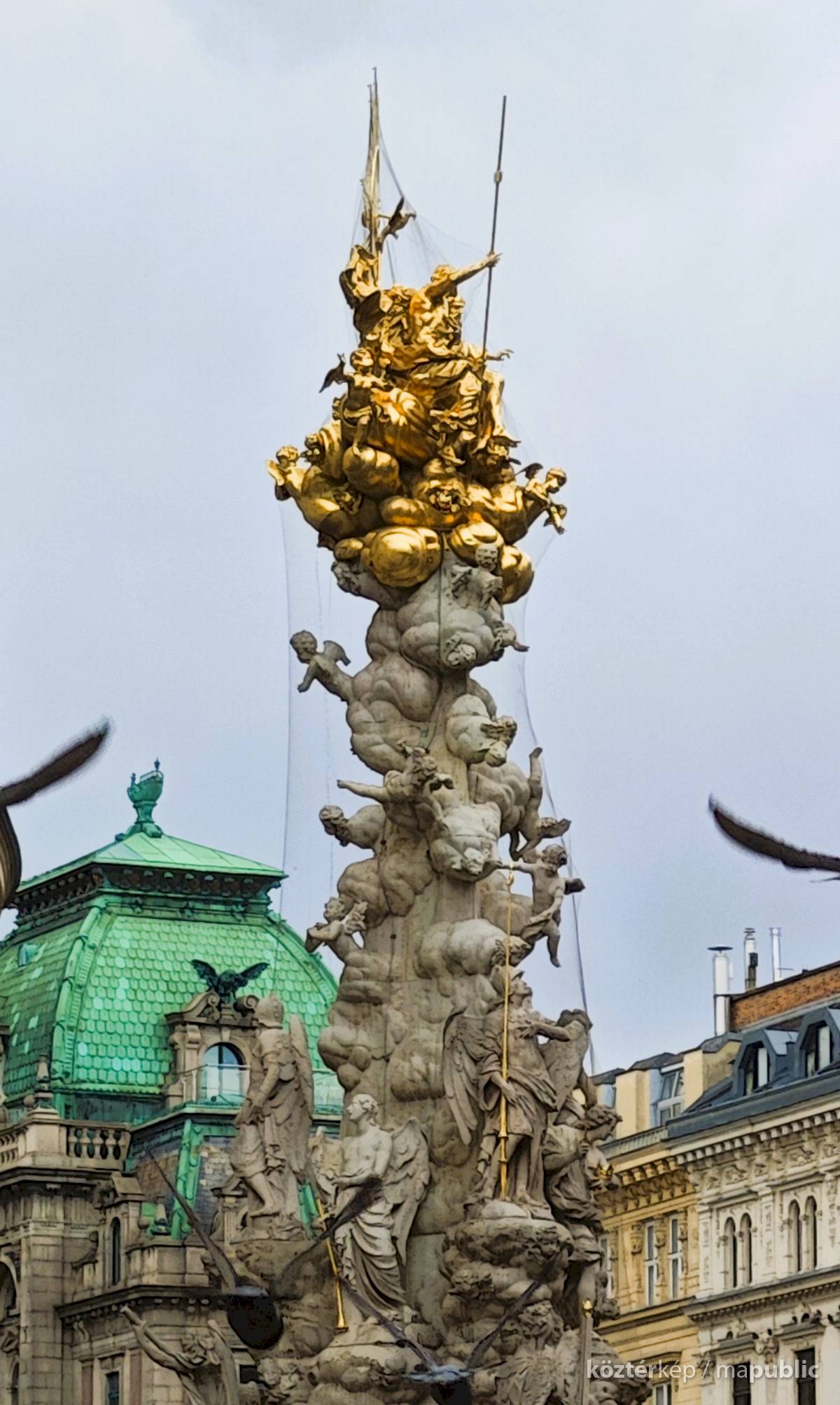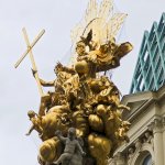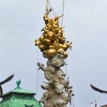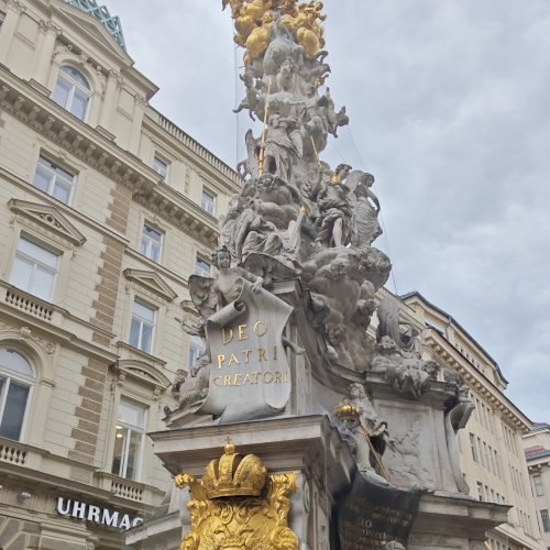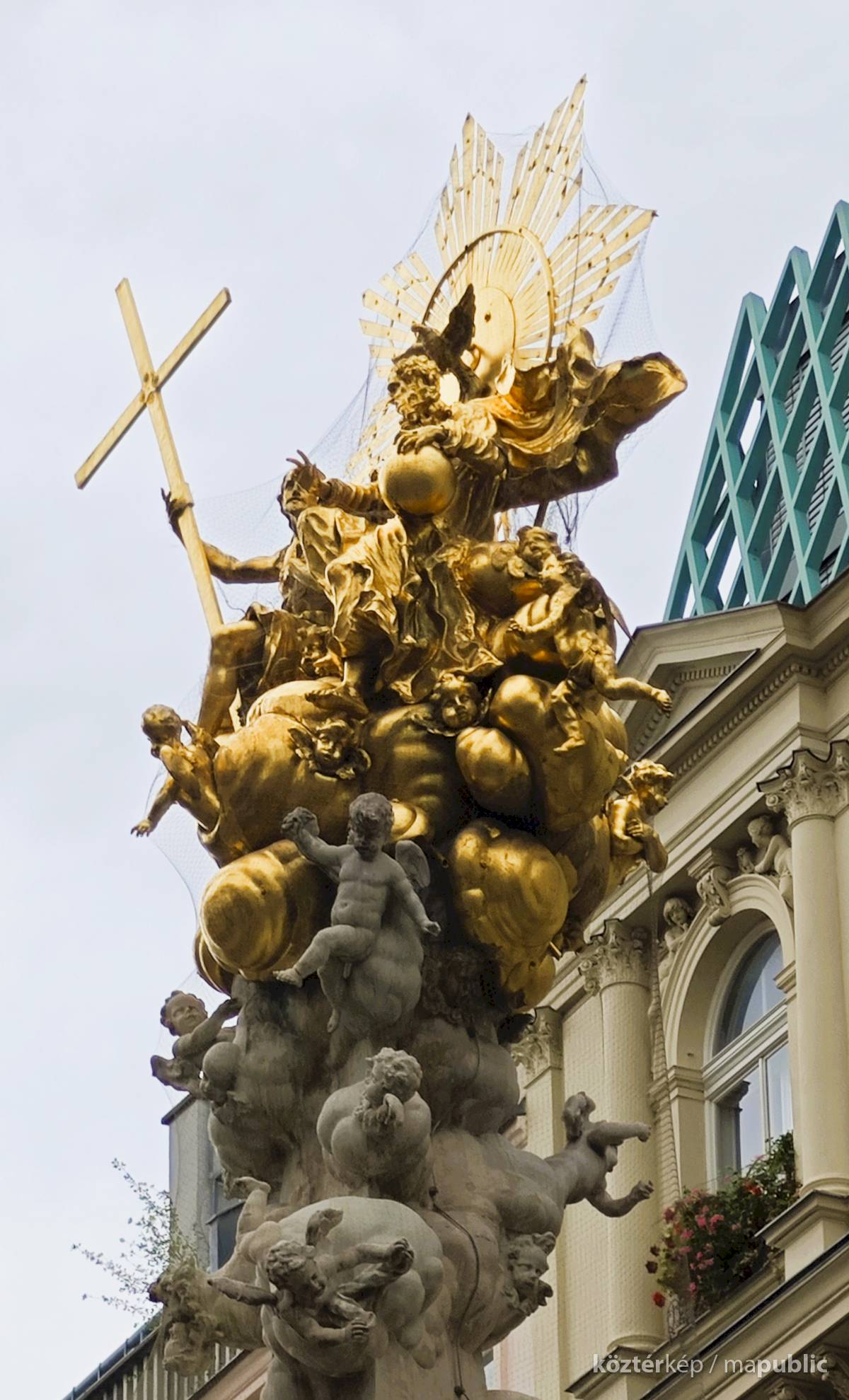"In 1679, Vienna was visited by one of the last big plague epidemics. Fleeing the city, the Habsburg emperor Leopold I vowed to erect a mercy column if the epidemic would end. In the same year, a provisional wooden column made by Johann Frühwirth was inaugurated, showing the Holy Trinity on a corinthian column together with nine sculpted angel (for the Nine Choirs of Angels).