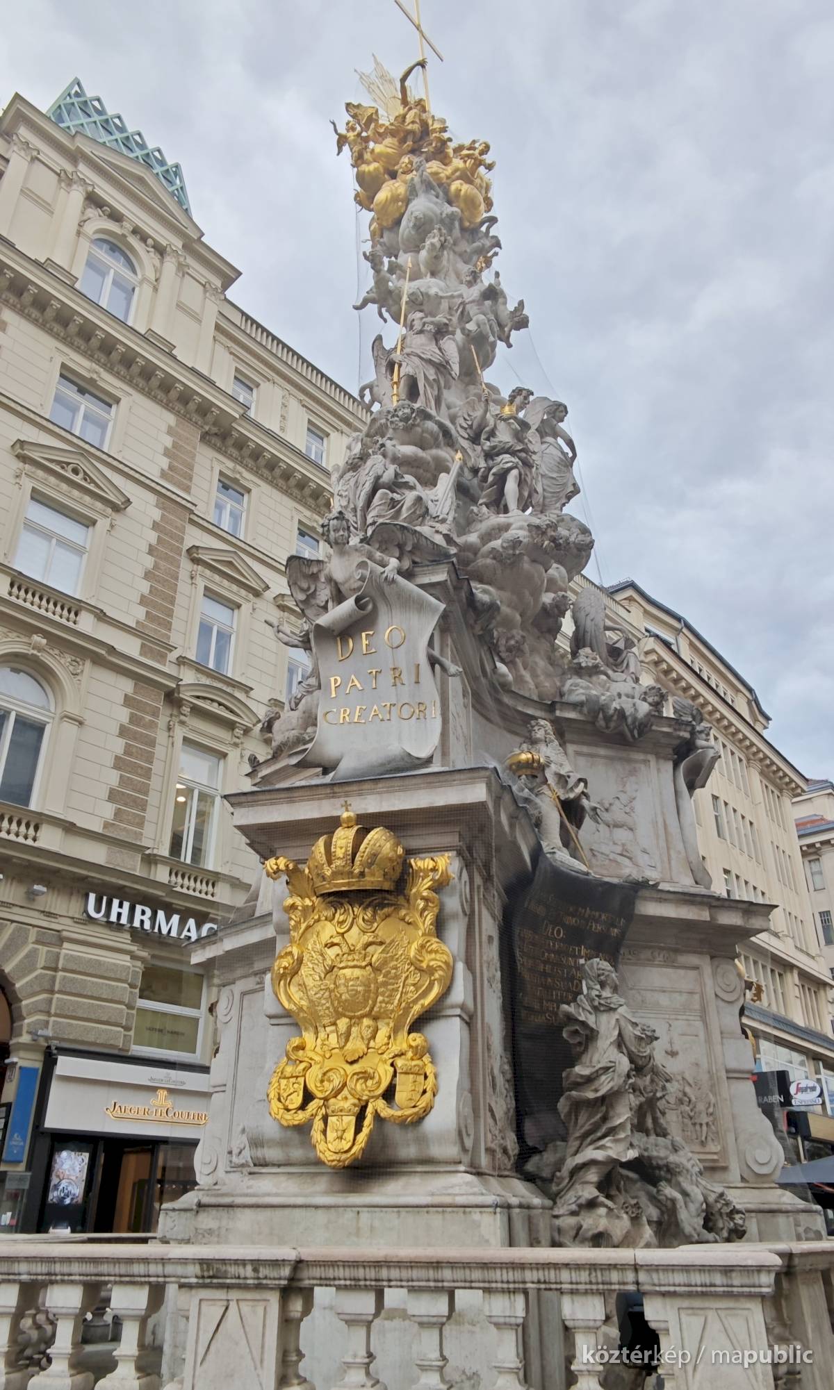 , Bécs volt egyik utolsó helyszíne a nagy járványnak. Mint akkoriban mindenhol, egy kegyelem oszlop állításával remélték a járvány végét. 1679-ben egy ideiglenes, fából készült oszlop került átadásra melyet Johann Frühwirth készített, amely egy Szentháromság oszlop volt. 1683-ban kapott megbízást márvány oszlop elkészítésére, de ő meghalt 1686-ban és az oszlop csak részben készült el. Számos új formatervezés követte, többek között Johann Bernhard Fischer von Erlach, aki a szobrot tervezte az oszlopra. Végül a munka alap koncepciójának kialakítását a színházi mérnök Lodovico Burnacinira bízta. Ennek alapján Burnacini elképzelésében az angyal szobrok felhőbe burkolóznak, valamint a térdelő Lipót császár imádkozik. Az oszlop szobrászai: Tobias Kracker és Johann Bendel. Az oszlopot végül 1693-ban avatták fel.