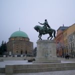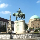 A szobor készítésére 1951-ben pályázatot írtak ki, melyet Pátzay Pál nyert el. A kivitelező személye tehát nem volt vitás, a szobor elhelyezése azonban igen. A város akkori vezetése két helyszínt, a Dóm teret és a Széchenyi teret találta alkalmasnak. Az eredeti elképzelés szerint a lovas szobor a Szentháromság-szobor helyére került volna, az alkotó azonban a tér délkeleti részét választotta. Véleménye szerint ugyanis a lovas szobornak oldalirányból van főnézete. Az elhelyezés tökéletesre sikerült, hiszen a műemlék minden irányból jól látható, azonnal szembetűnik. Aszimmetrikus elhelyezkedése szinte a dzsámi szabálytalan tájolását ismétli meg." ( http://varoslako.pecs.hu/cikk/0829/277824/20080716_pecs_szobor_13.htm )