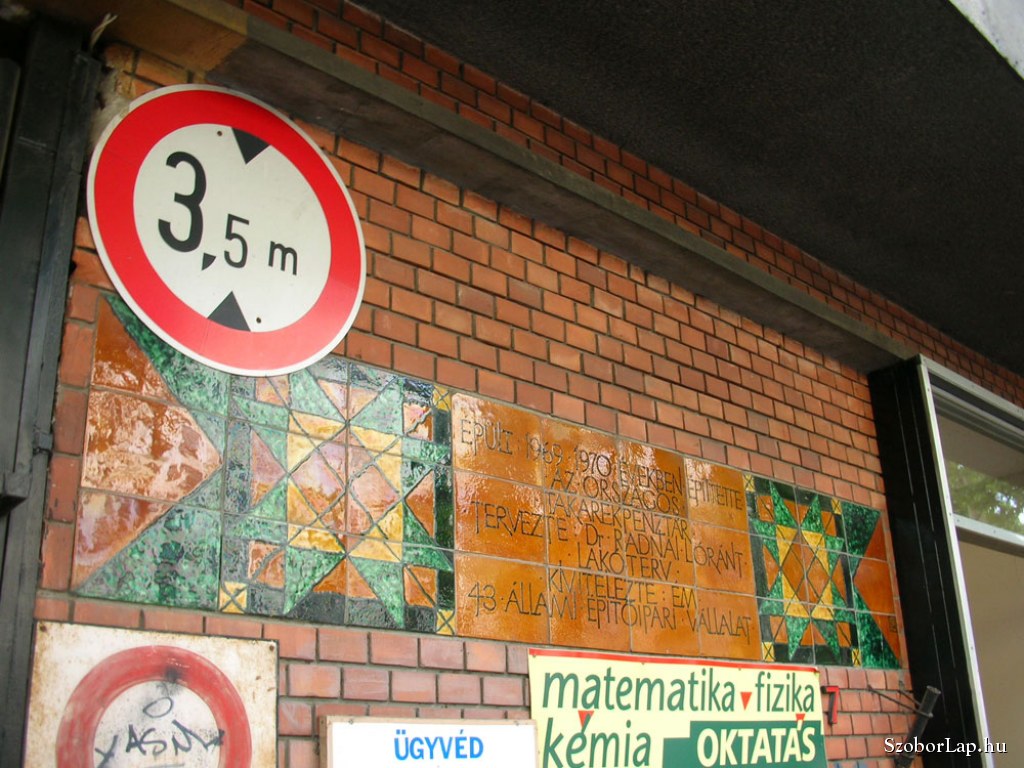 A többemeletes társasház dr. Radnai Lóránt tervei szerint épült fel 1970-ben. Az épület két bejárata melletti falon található a színes, mázas kerámiacsempékből álló alkotás. A művön találtam egy R CS nanogrammot, amit sajnos még nem sikerült beazonosítanom.