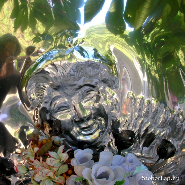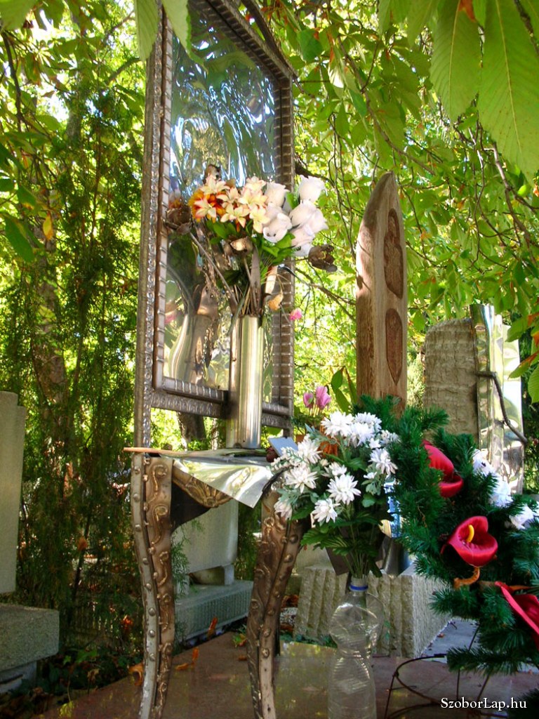 A síron található krómacél színházi fésülködő asztal benne a színésznő képmásával Varga Imre szobrászművész alkotása.
