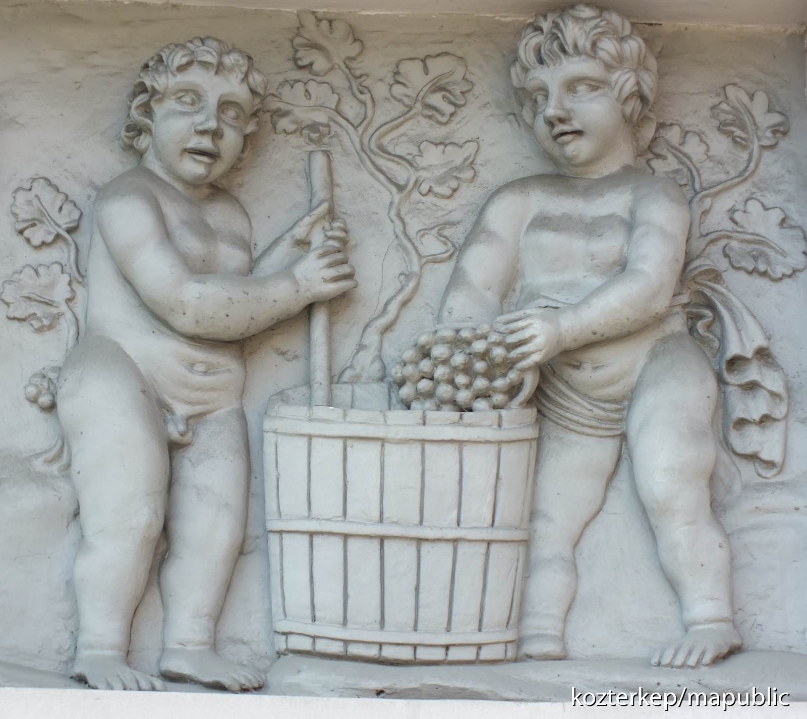 "A kőtáblák a 4 évszakot jelenítik meg, a rajtuk lévő 12 puttó pedig a hónapokat. Minden domborművön három szereplő figyelhető meg. A bal oldalt lévő művön a márciust jelképező puttó egy pillangót enged szabadon, mely a mellette lévő virágok felé száll jelezve ezzel, hogy ezeknek megporzása kezdődik ebben a hónapban. Az áprilist jelképező alak egy kosár virággal látható, a májust pedig egy korsó vizet készül kiönteni, ezzel utalva a „májusi eső aranyat ér” szólásra. A következő táblán a júniust jelképező puttó búzát arat utalva az ebben a hónapban kezdődő betakarításra, a júliust megjelenítő aratókosárban hozza neki az ételt, az augusztust ábrázoló alak pedig elégedetten alszik az összekötözött gabonakévéken. Testtartása az antik Endümión-ábrázolásokat idézi, lábánál oroszlán hever, utalva a hónap jellemző csillagképére. A szeptembert jelképező puttó szőlőt szüretel (valószínűleg kék szőlőt – budai kadarkát vagy budai vöröset), két társa pedig a lebogyózott gyümölcsöt áztatja egy nagy dézsában. Közöttük egy – az antik „ugró kecske” ábrázolások mintájára megjelenített – kos látható, mely arra utal, hogy a szüreti ünnepségek elmaradhatatlan étele volt a birkahús, mely ez időszakban még nem olyan faggyús ízű, mint télen. Az utolsó táblán december alakja tüzet szít, míg január (a leghidegebb hónap) melegszik mellette, a februárt megjelenítő puttó pedig fűzfavesszőket hoz, melyeket ekkor szoktak levágni kosárfonás céljára."