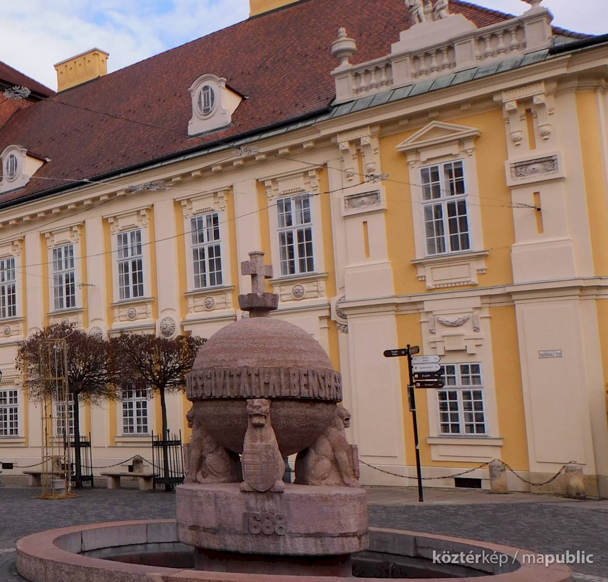 A közismertebben Országalmának nevezett díszkút építését 1941 második felében kezdték el, s 1943 szeptemberére fejezték be. A kőtömb tetején a kereszt a kereszténység felvételére, az alatta lévő úgynevezett falkorona a város koronázó város státuszára utal. Az oroszlánok az ország címerét, a városcímert és II. András király címerét tartják. Alattuk az évszámok: 1001 (István király koronázása), 1688 (a város török alóli felszabadulása), 1938 (Szent István halálának 900. évfordulója).