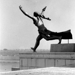 "....Másfajta élményeim természetesen más műfajokkal és hol dúsan, érzékenyen mintázott felület, hol pedig monumentálisán testes plaszticitás igényével társulnak egy-egy szerkezetté. Most, amikor a tiszalöki erőmű szobrán — egy nyolométeres rohanó női alakon — dolgozom, szüntelenül a monumentális plaszticitás és az architektúrával szervesen összefüggő mozgás köti le a gondolataimat s ad bőségesen tennivalókat...." [1]