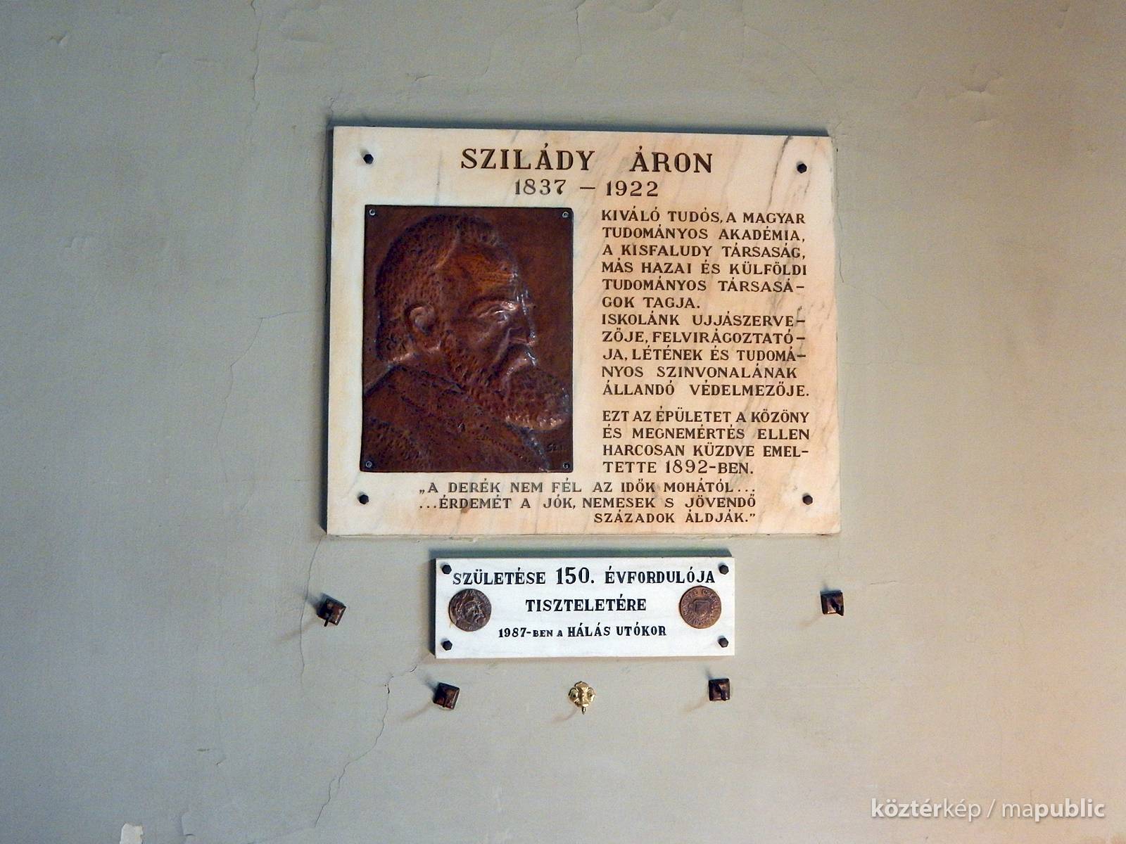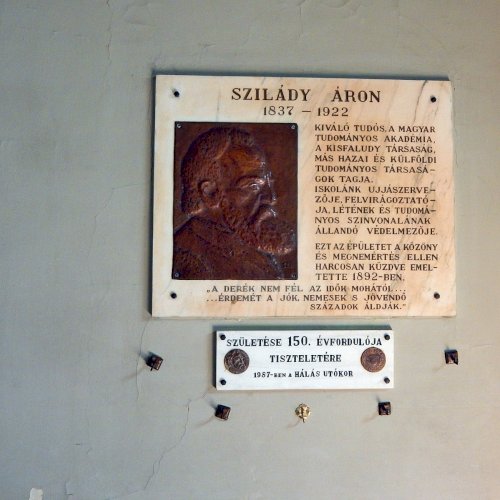 1987. október 30-án Szilády Áron születésének 150. évfordulójára helyezték el Szanyi Béla kőfaragó által készített 58x19 cm-es emléktáblát.