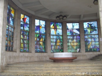 A Traumatológiai Intézet főbejárati szélfogójának színes üvegablakai (